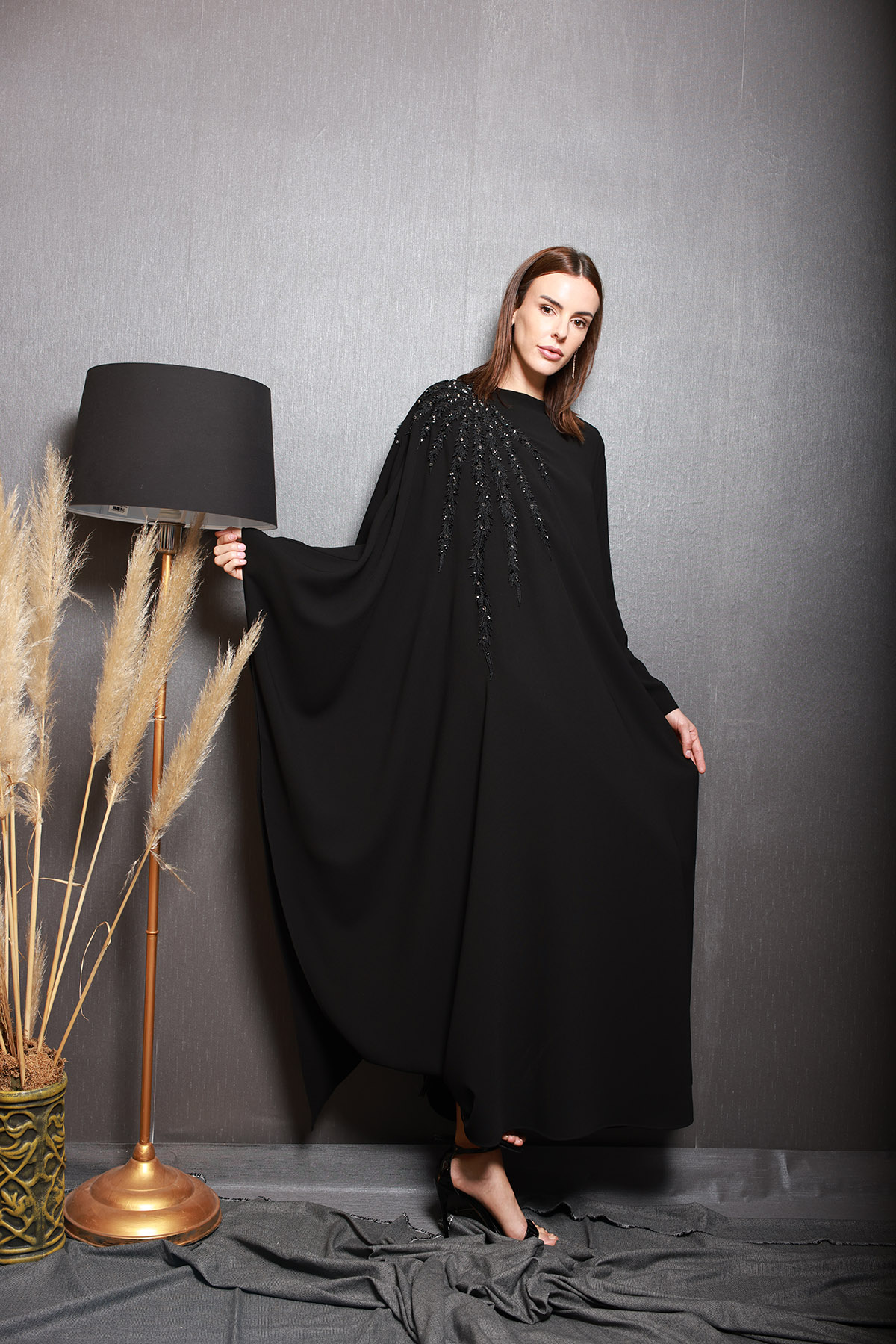 Dress Siyah Özel Tasarım Kaftan Şeklinde Gösterişli Dökümlü Eleganze Casual Elbise