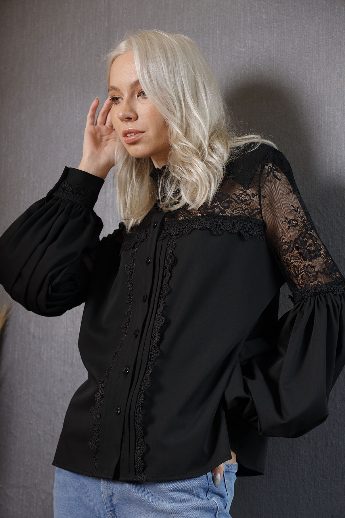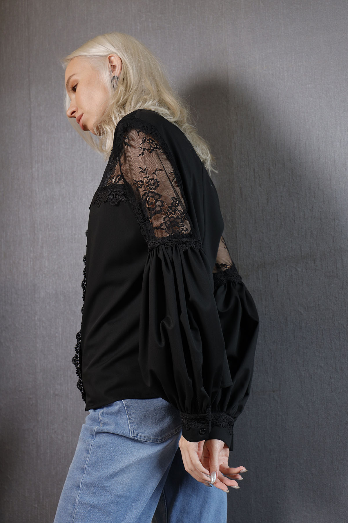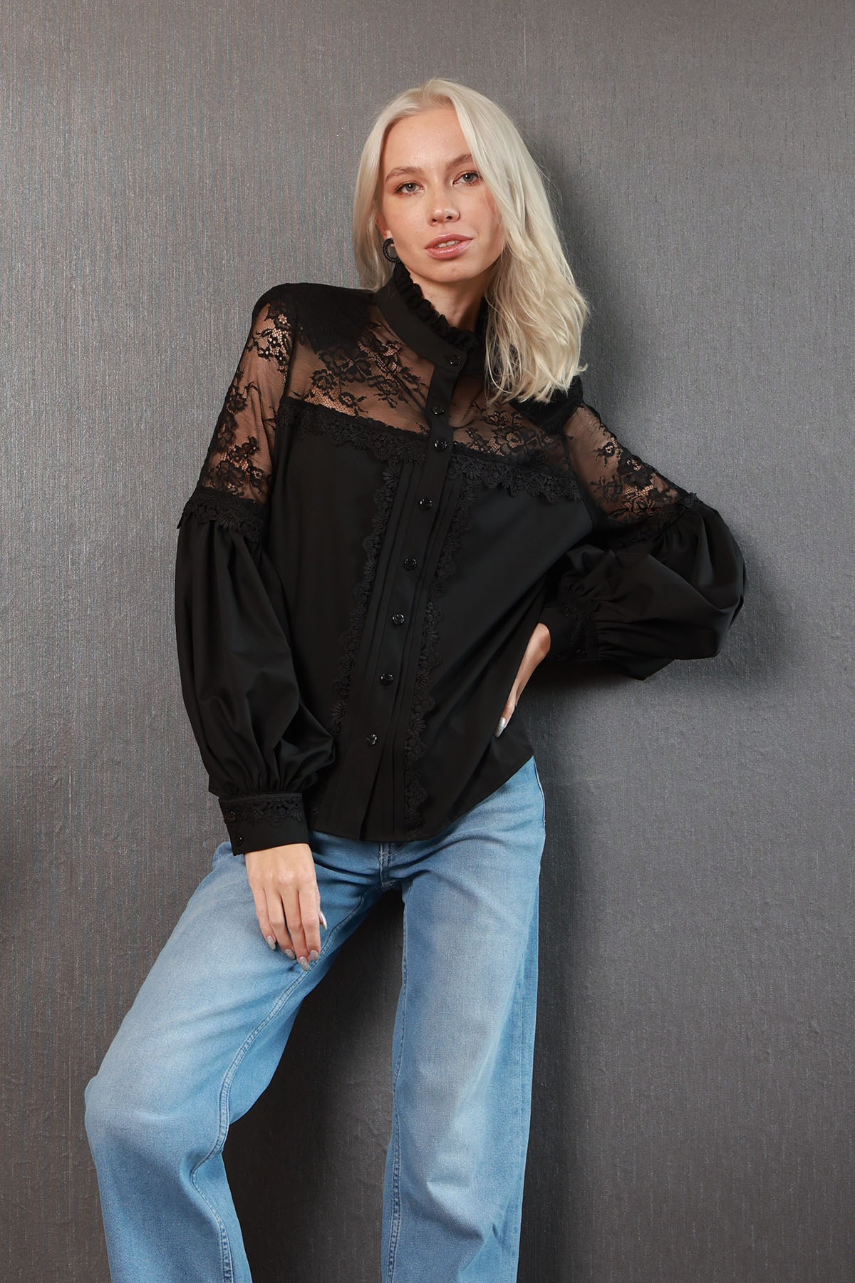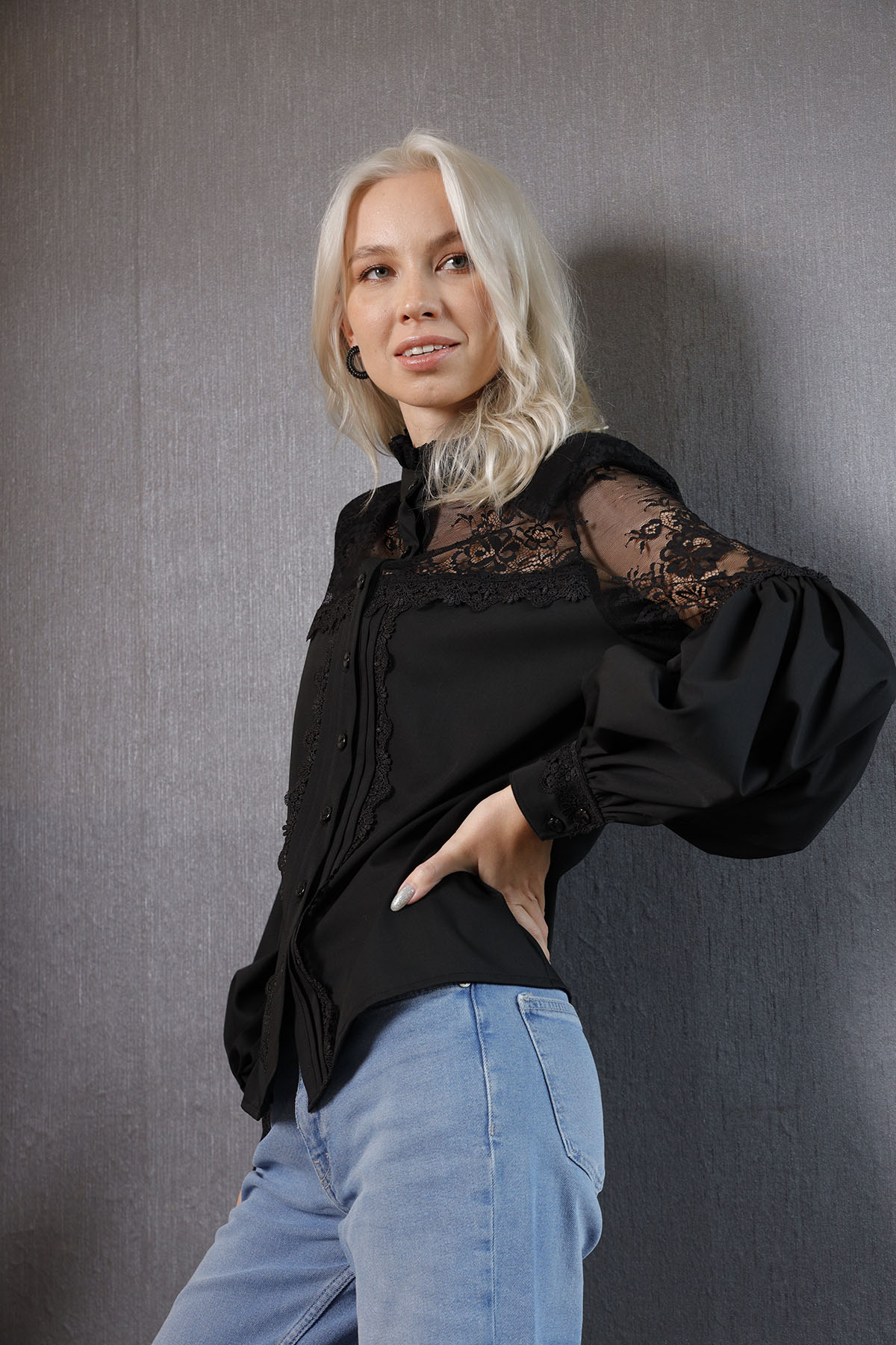 Black Shirt koleksiyonumuzun parçalarından %100 coton kumaştan ön omuz kısmı ve kol dirseğe kadar olan kısmı fransız danteli ve kumaş dantel birleşim