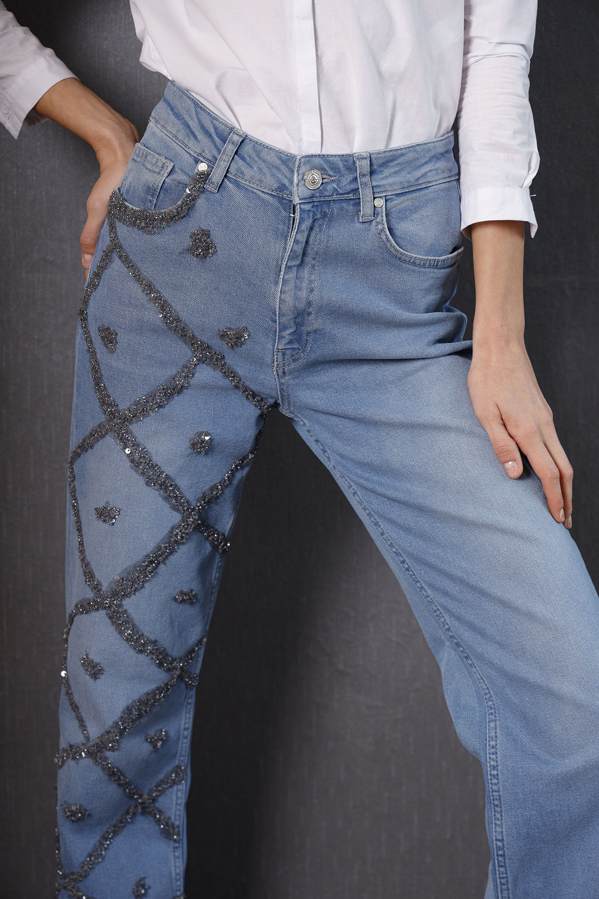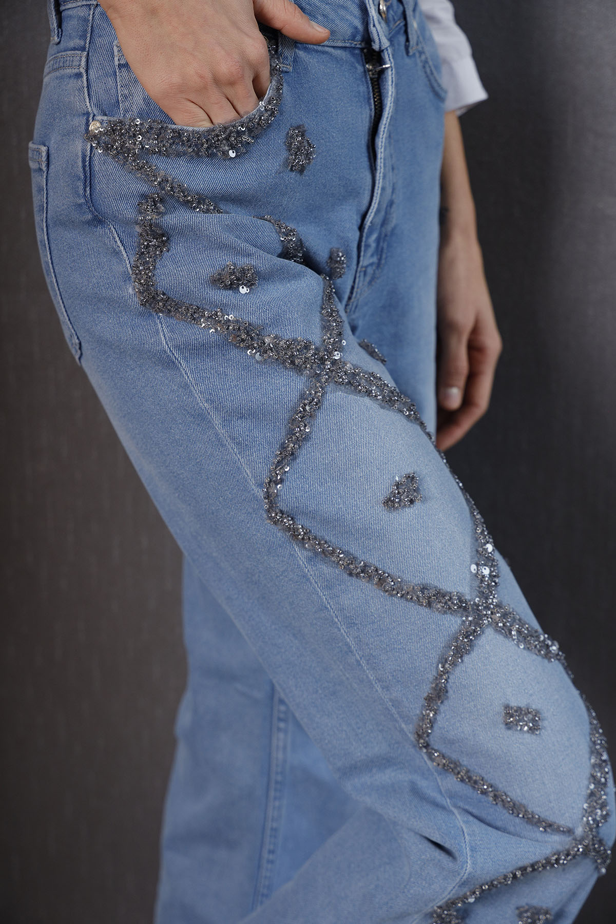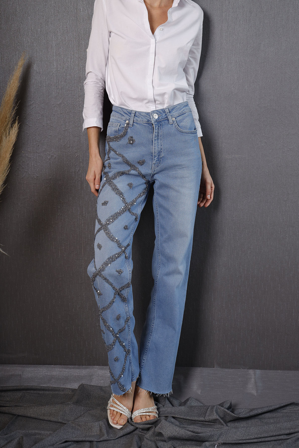 %98 pamuk %2 lycra kumaştan Jean kumaşı olup, sağ paçası özel işleme taşlar ile süslenmiştir.