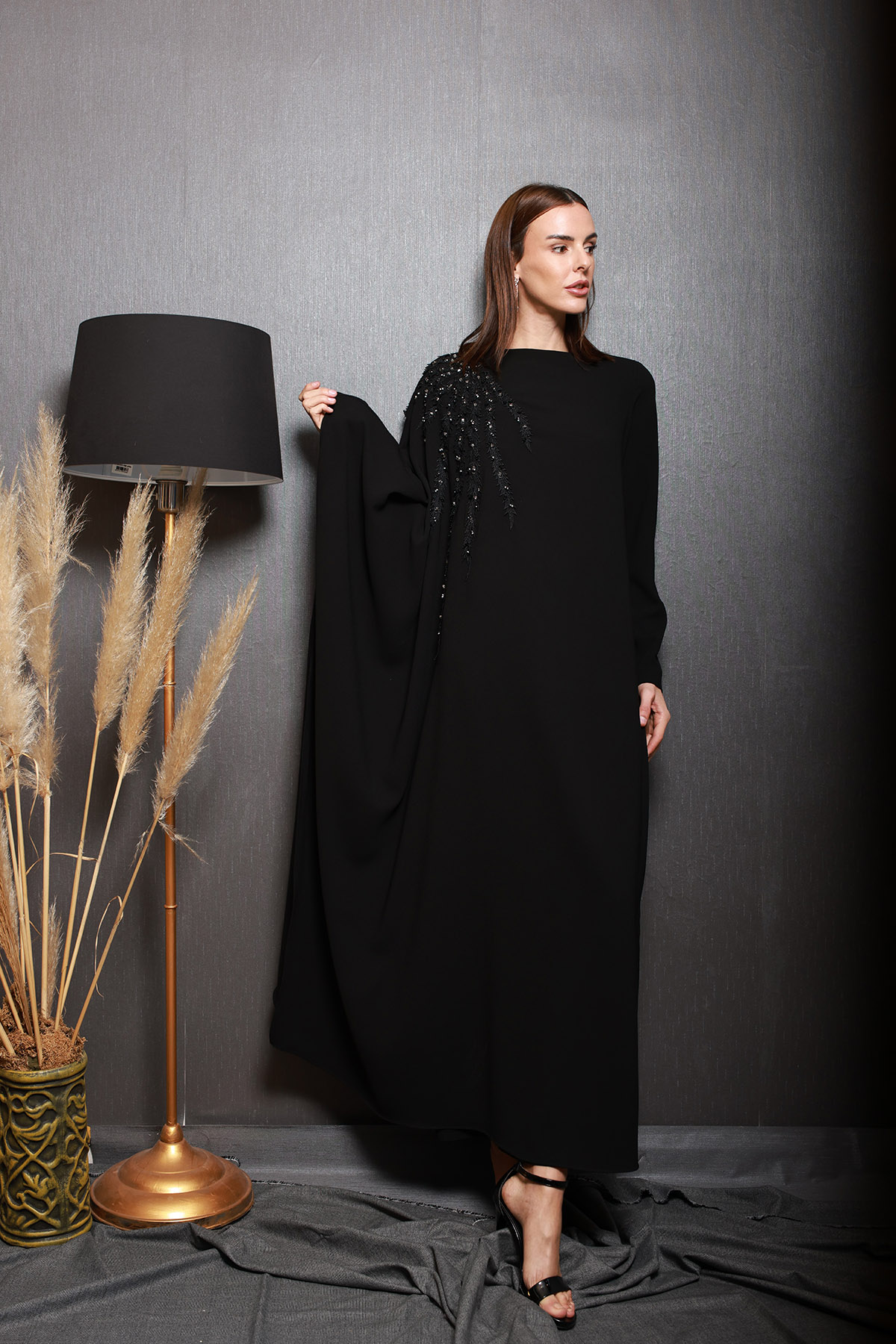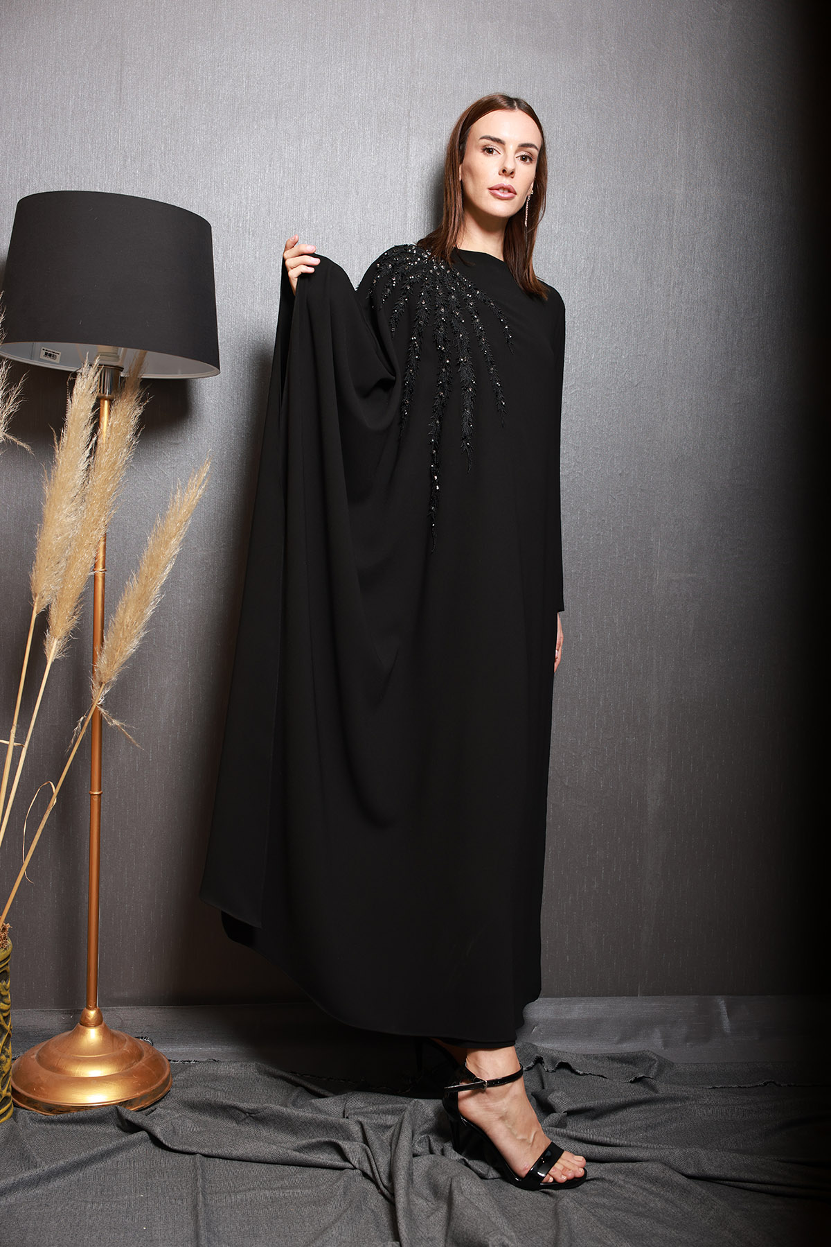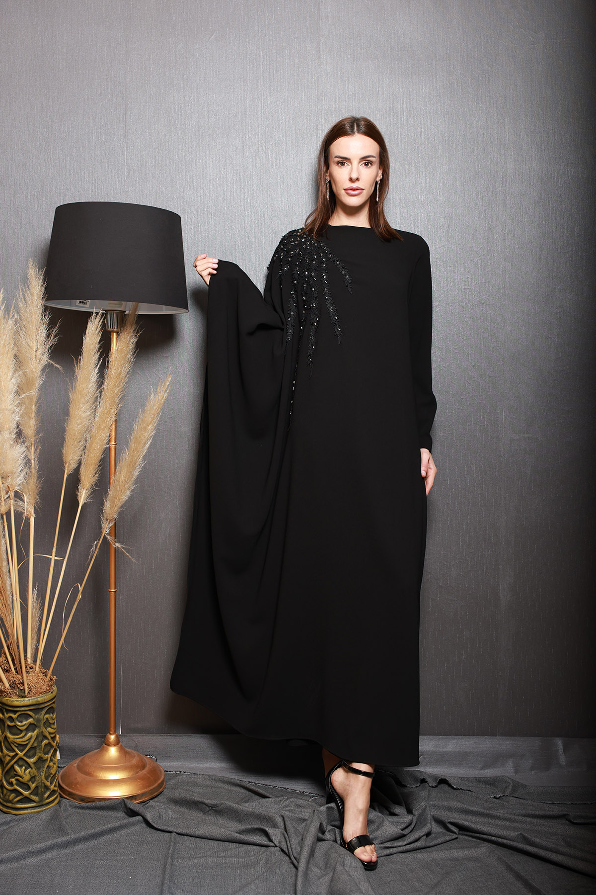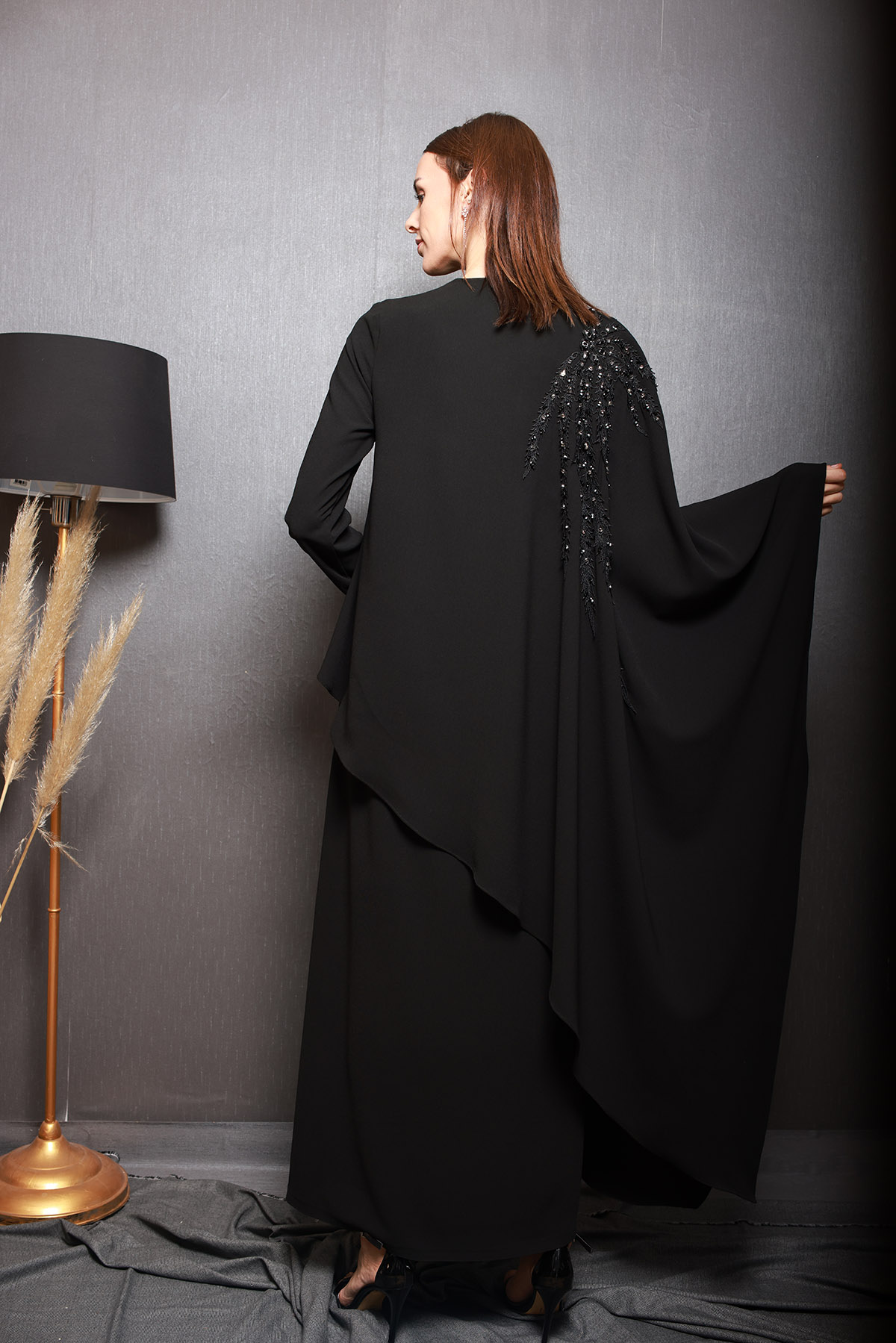 Bol, gösterişli, dökümlü, sol omuz kısmından bedene doğru akan taş işlemeli desenli aksesuar vardır.