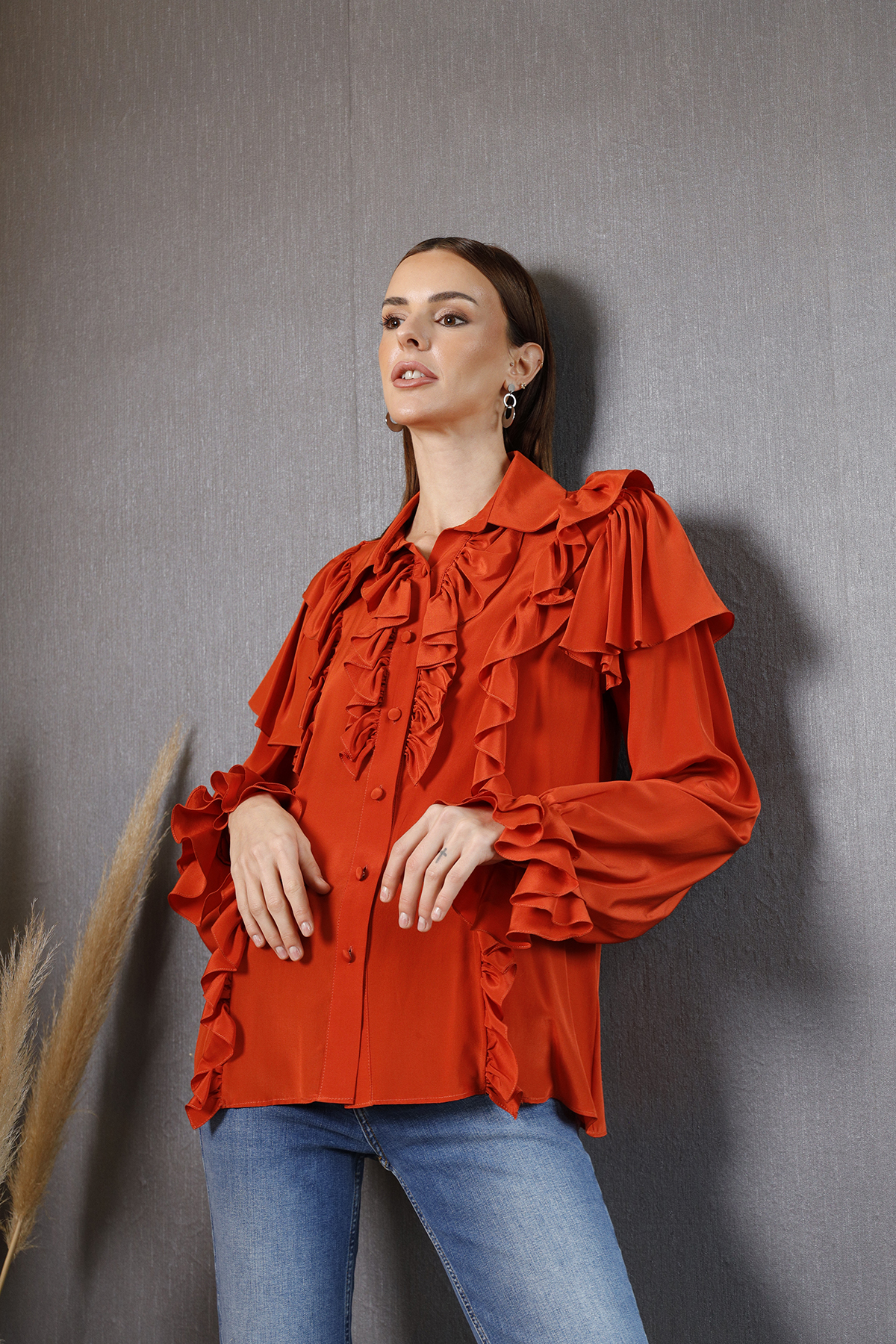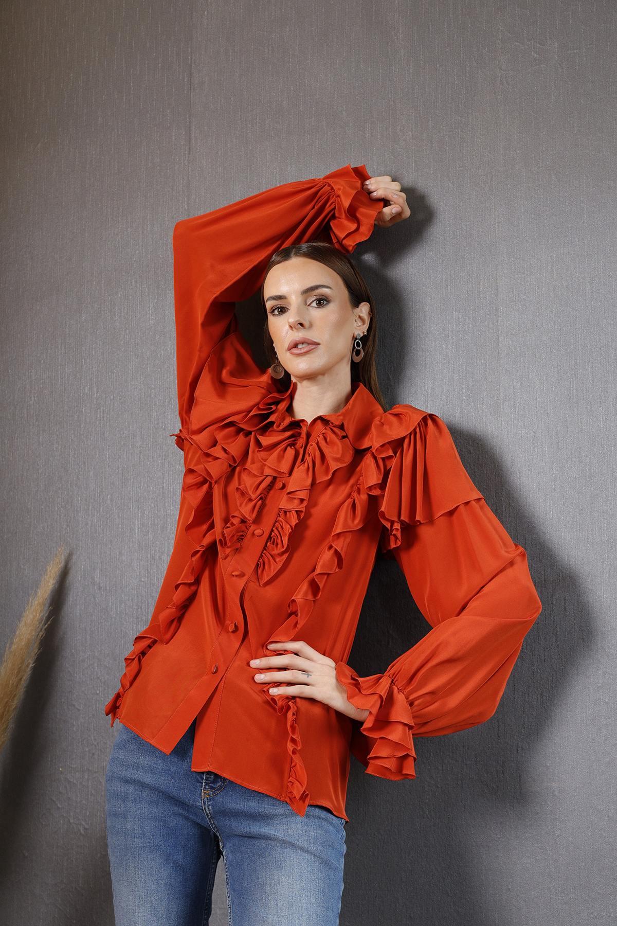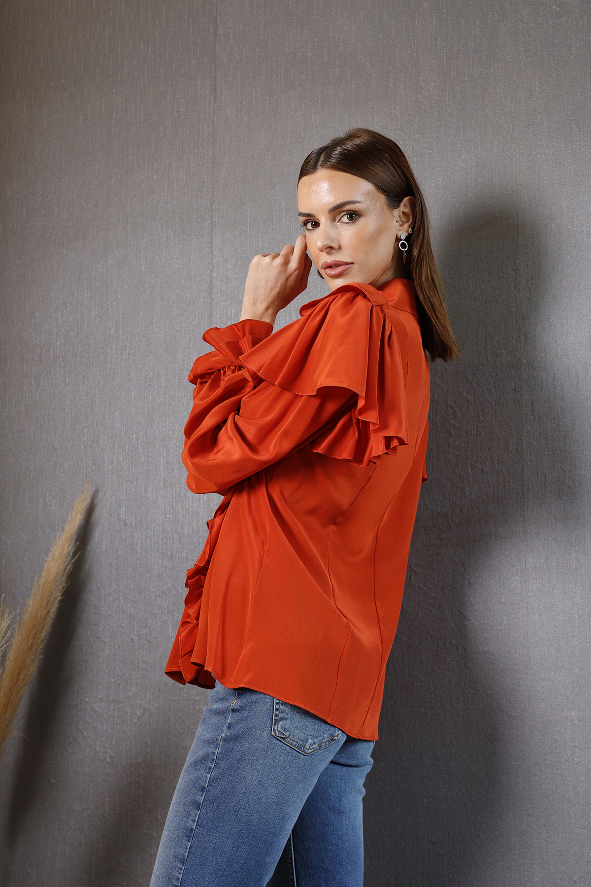 Elica Turuncu İpek Saten Volanlı Şık Tasarım Gömlek