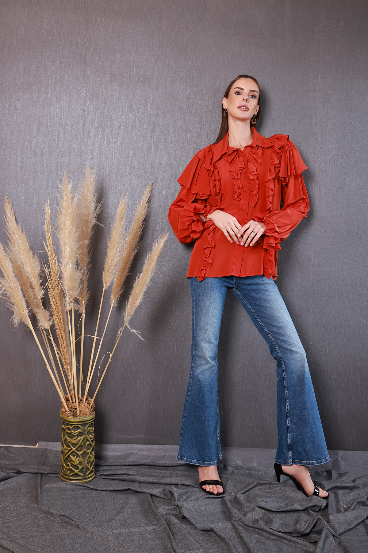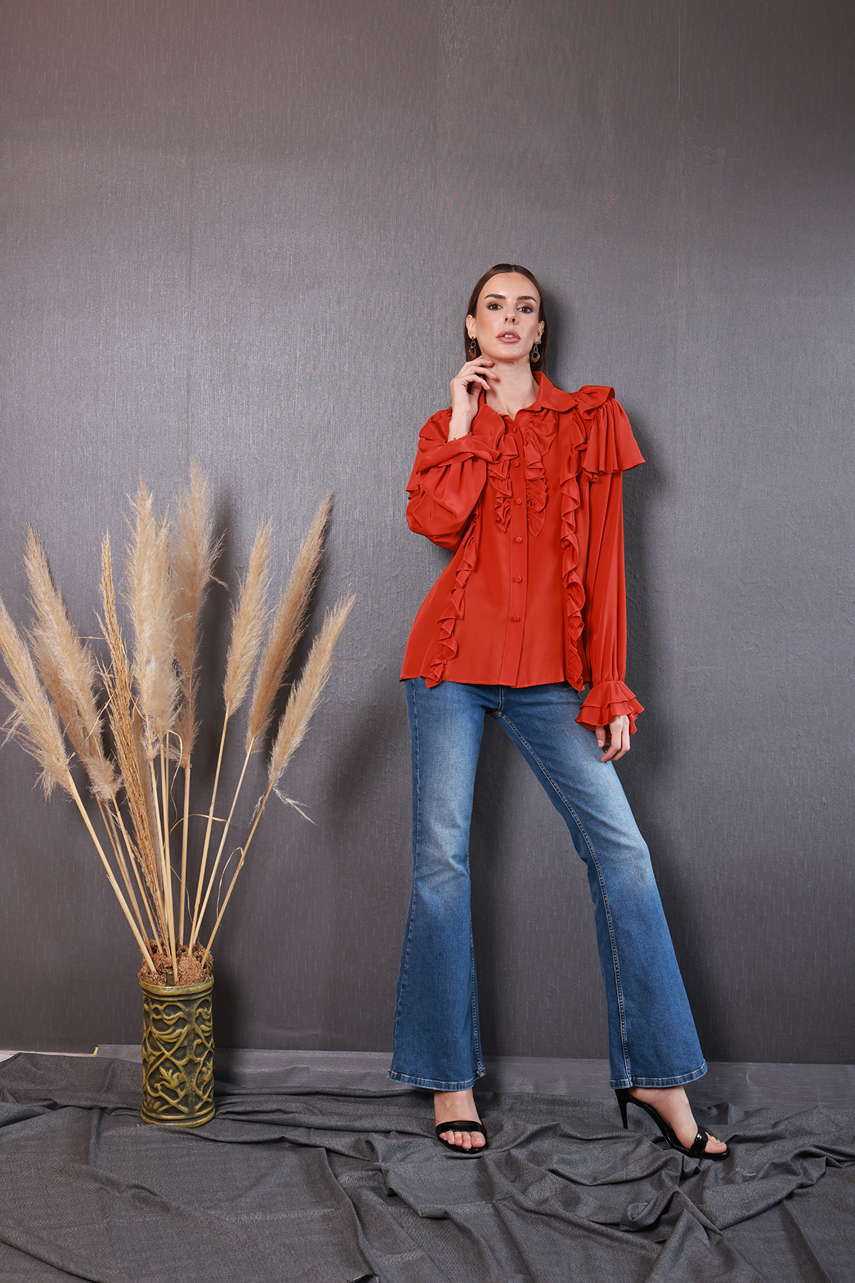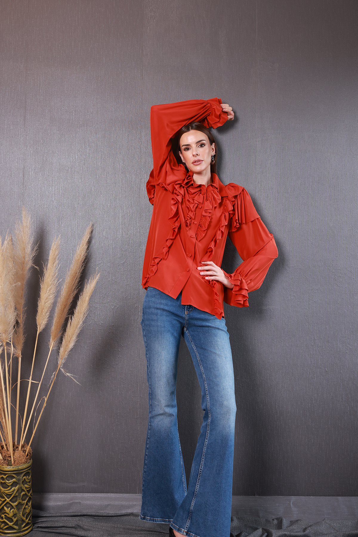 Elica Turuncu İpek Saten Volanlı Şık Tasarım Gömlek