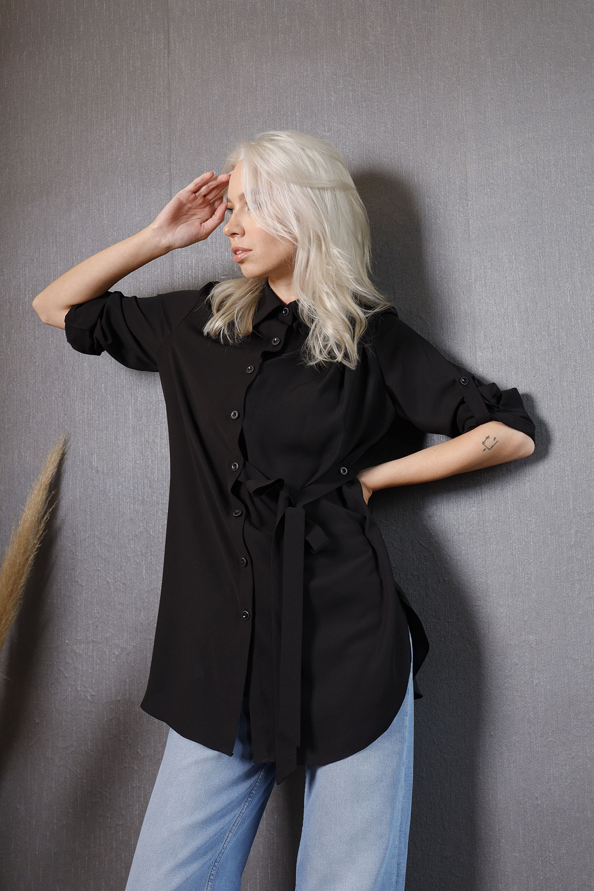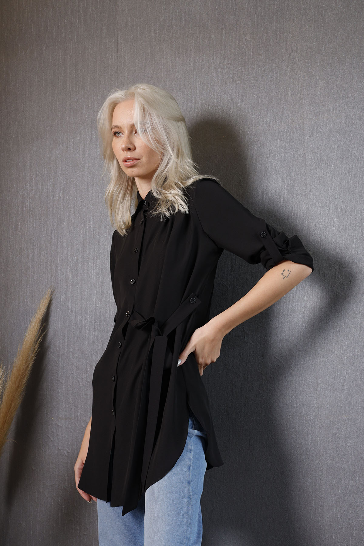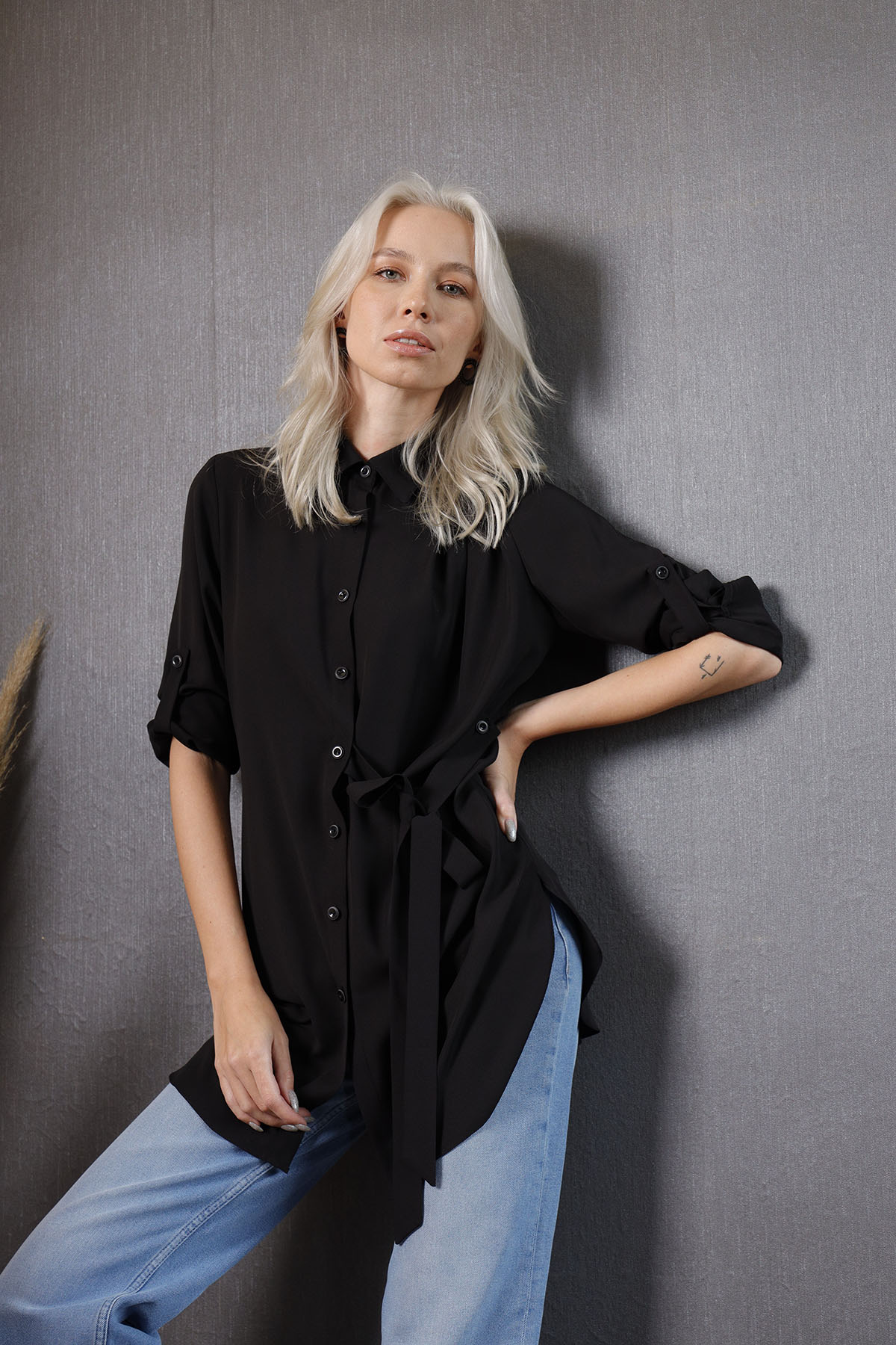 Black Shirt koleksiyonumuzun parçalarından olup, ön patı ve manşetler ile kollarında özel düğmelerle süslenmiştir.