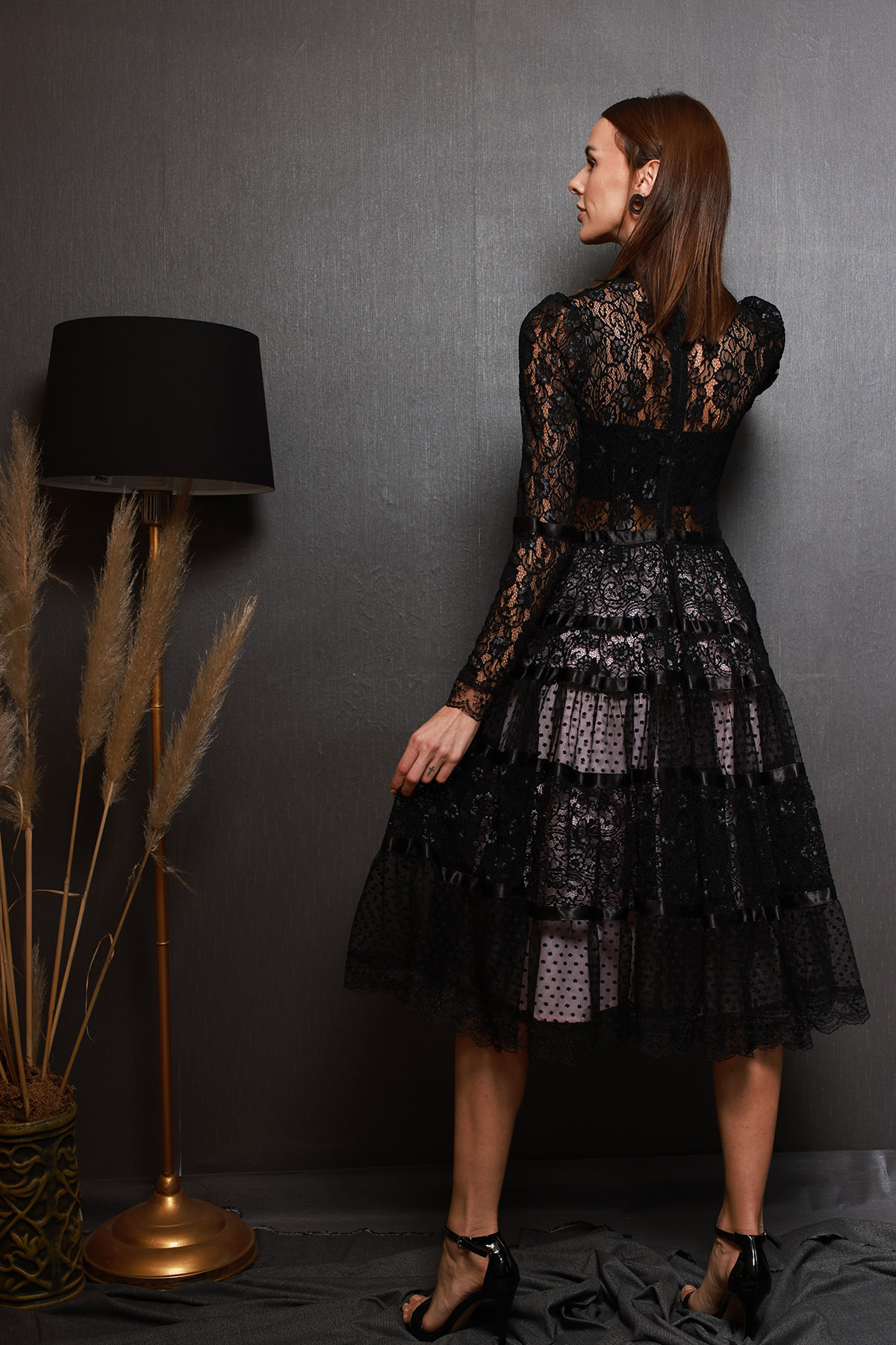 Bedeni slimfit vücuda oturan, eteği daire, dökümlü formunda kat kat, dantel ve puantiye tülden oluşan uzun kollu, üst beden transparan, eteğinde pembe silk astardan yapılmış balo, davet, casual elbise.