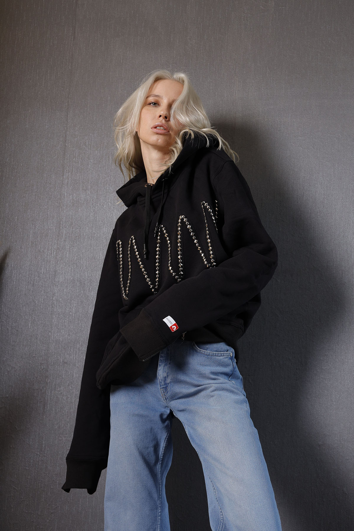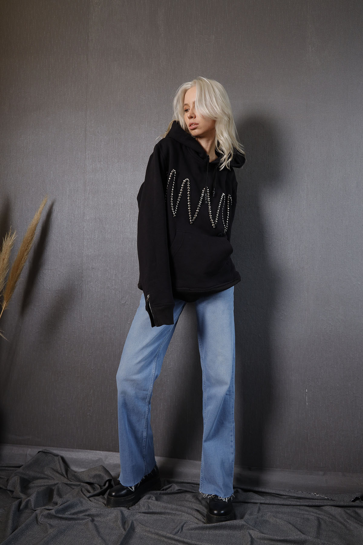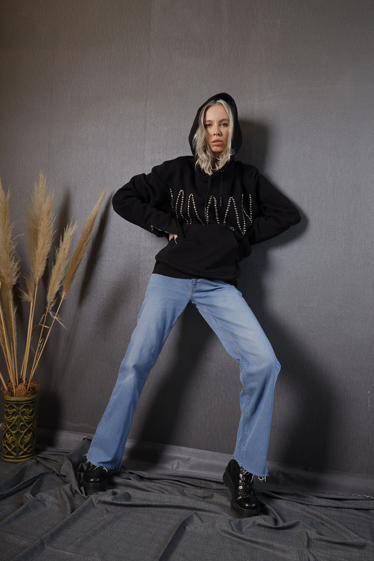 %100 pamuk üç iplik şardonlu kumaştan üretilmiş Hoodie, ön bedende göğüs kısmı taşlı aksesuarla tasarlanıp şekillendirilmiş olup, kol manşetlerinde 1.sınıf metal fermuar kullanılmıştır.