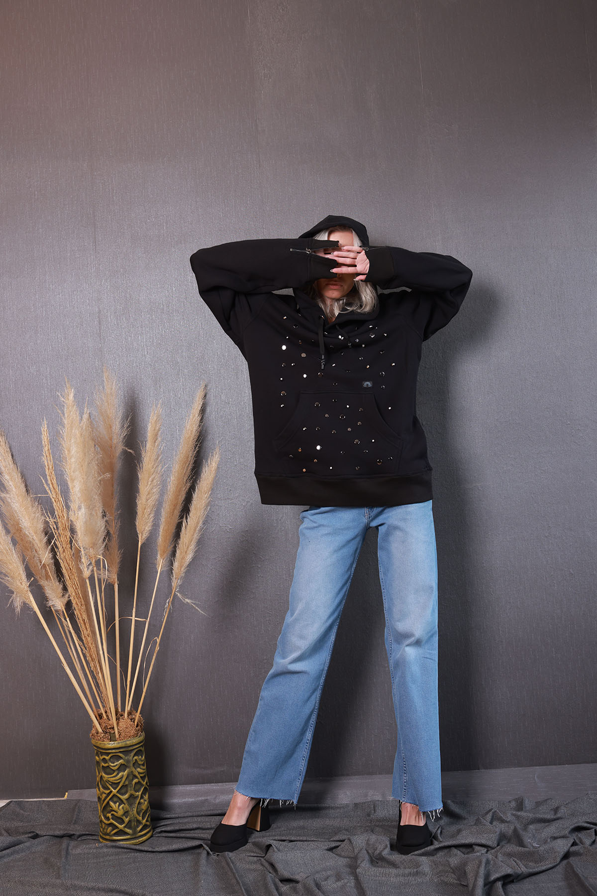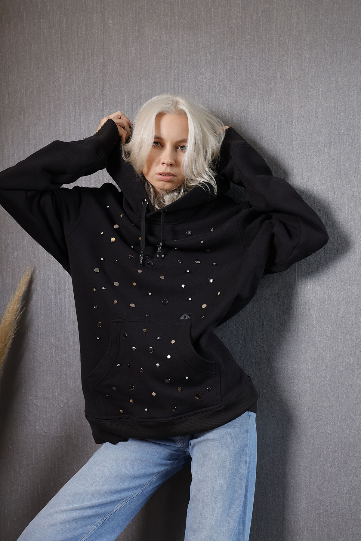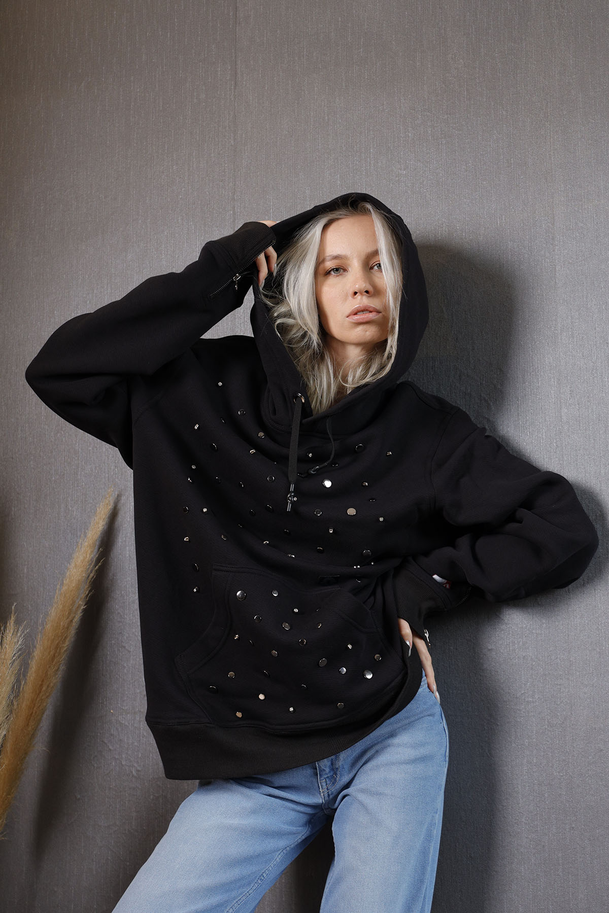 %100 pamuk üç iplik şardonlu kumaştan üretilmiş Hoodie, ön bedende göğüs kısmı taşlı ve şık rivetlerle tasarlanmış olup, kol manşetlerinde 1.sınıf metal fermuar kullanılmıştır.