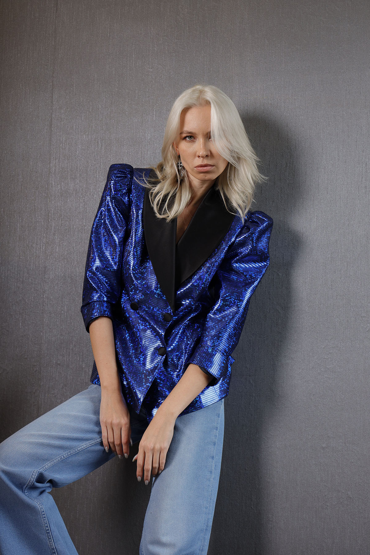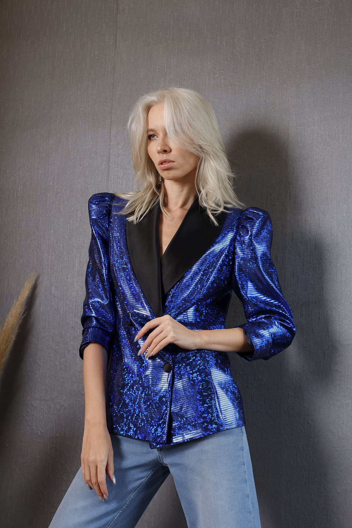 Luce Mavi Siyah Dikdörtgen Baskılı Yakası ve Düğmeleri Siyah İpek Kumaş Baskılı Modern Kruvaze Ceket