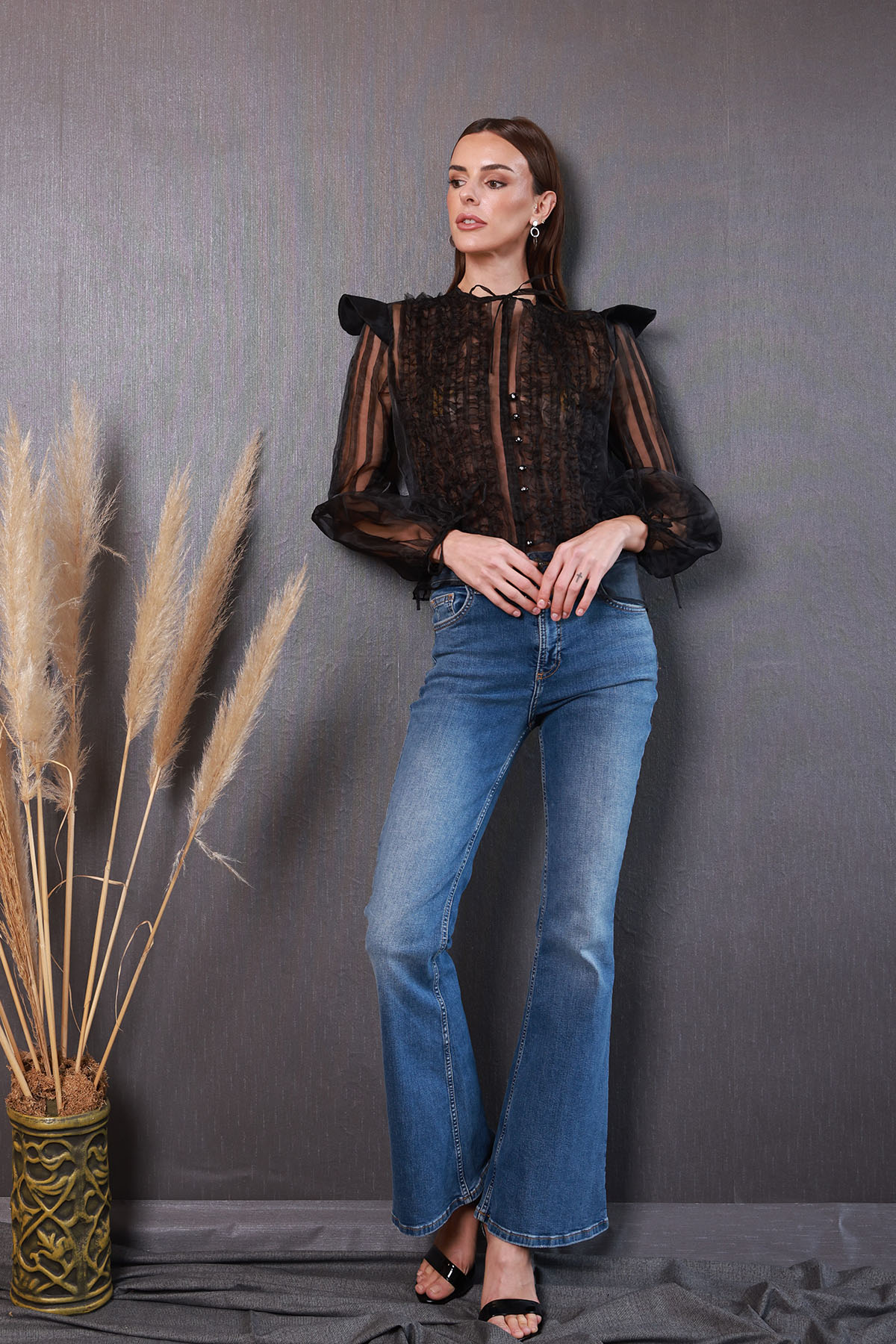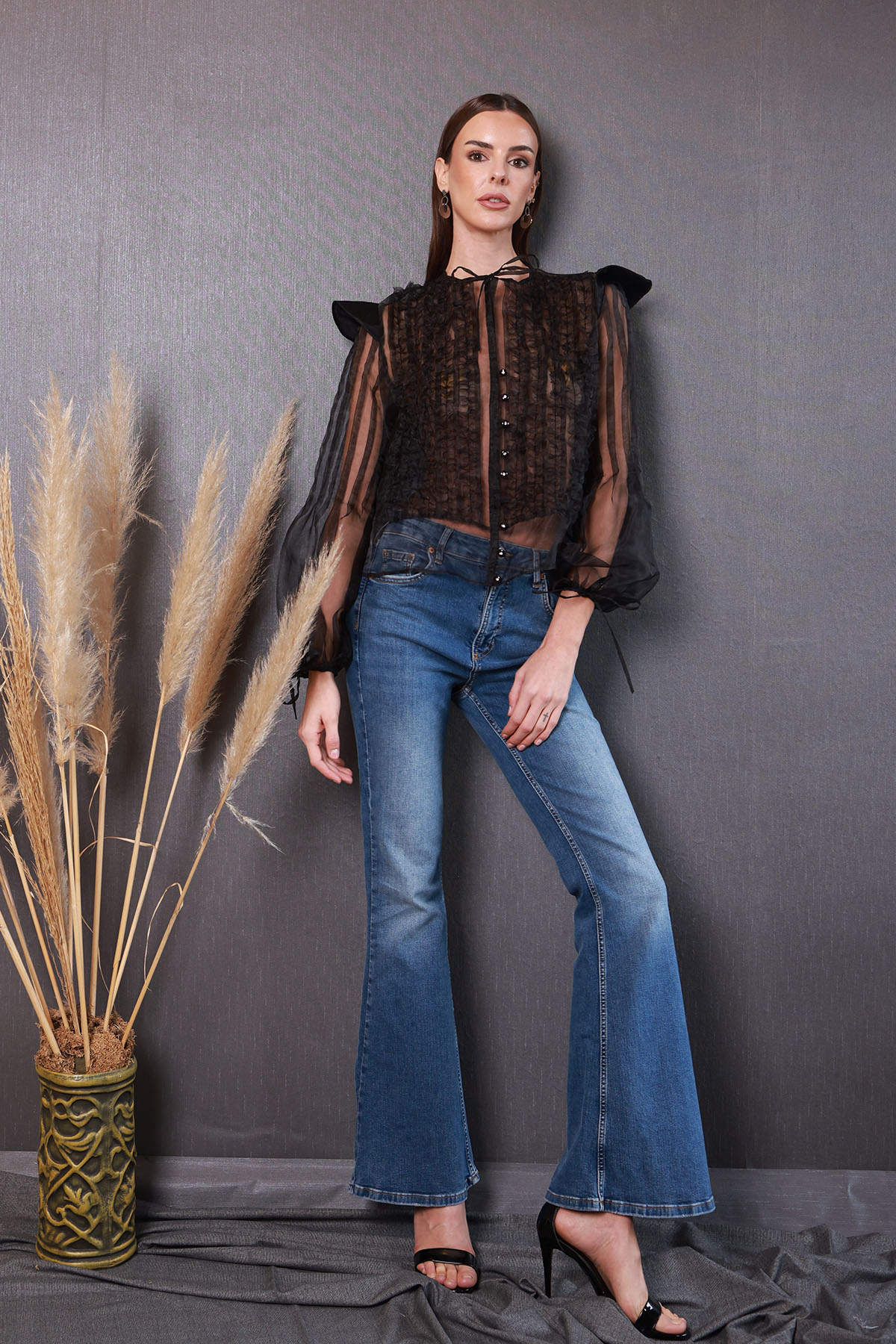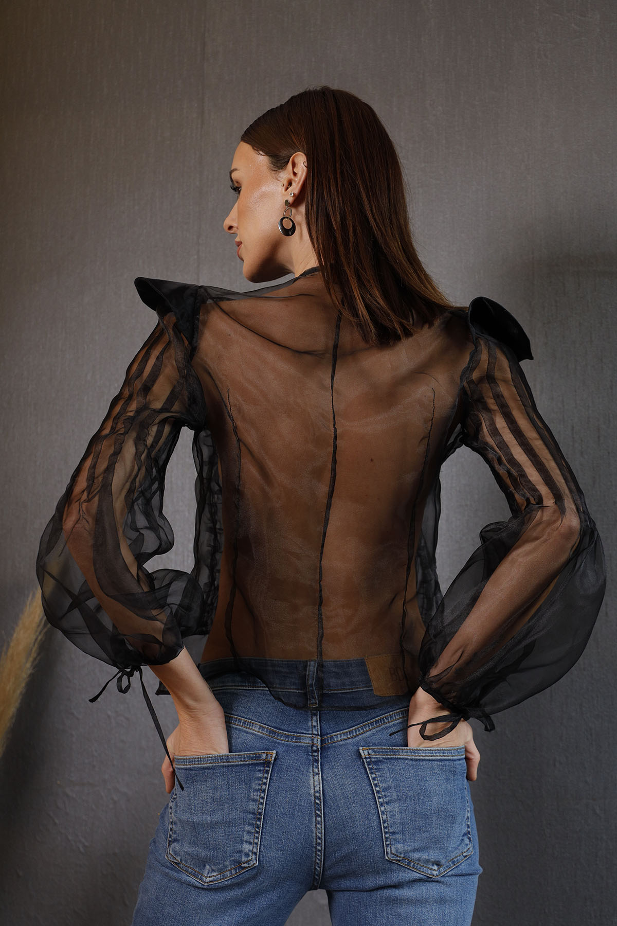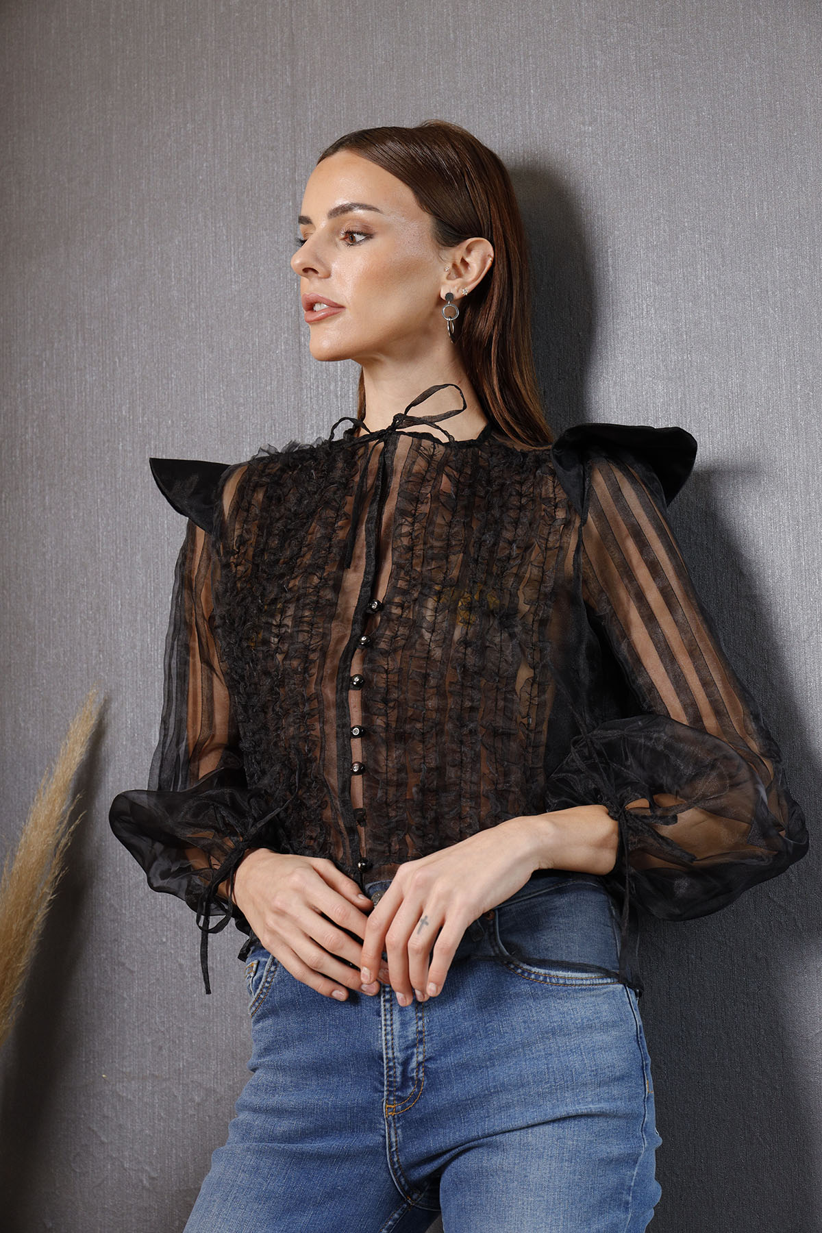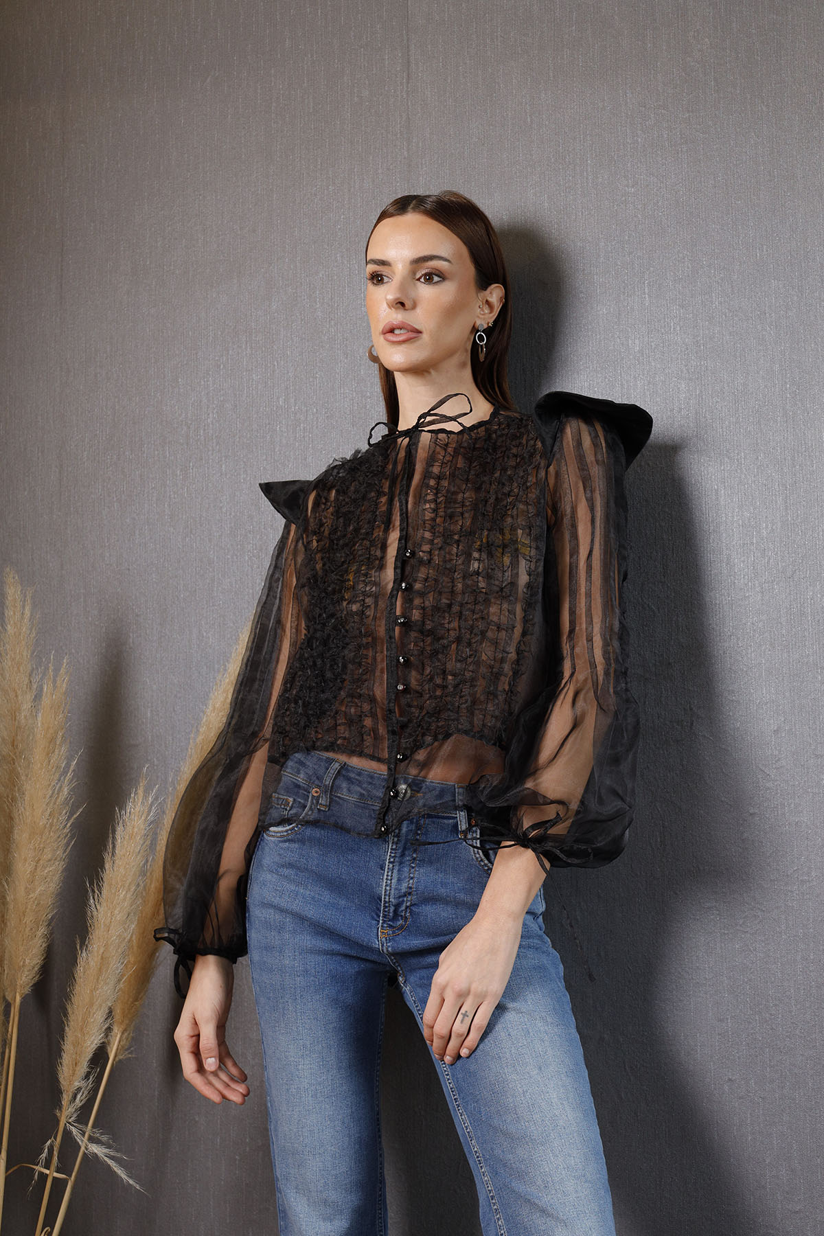 Black Shirt koleksiyonumuzun parçalarından organze kumaştan önü birit ve düğmeli, önlerde ince fırfırlardan oluşan modern desıgn ile yapılmıştır.