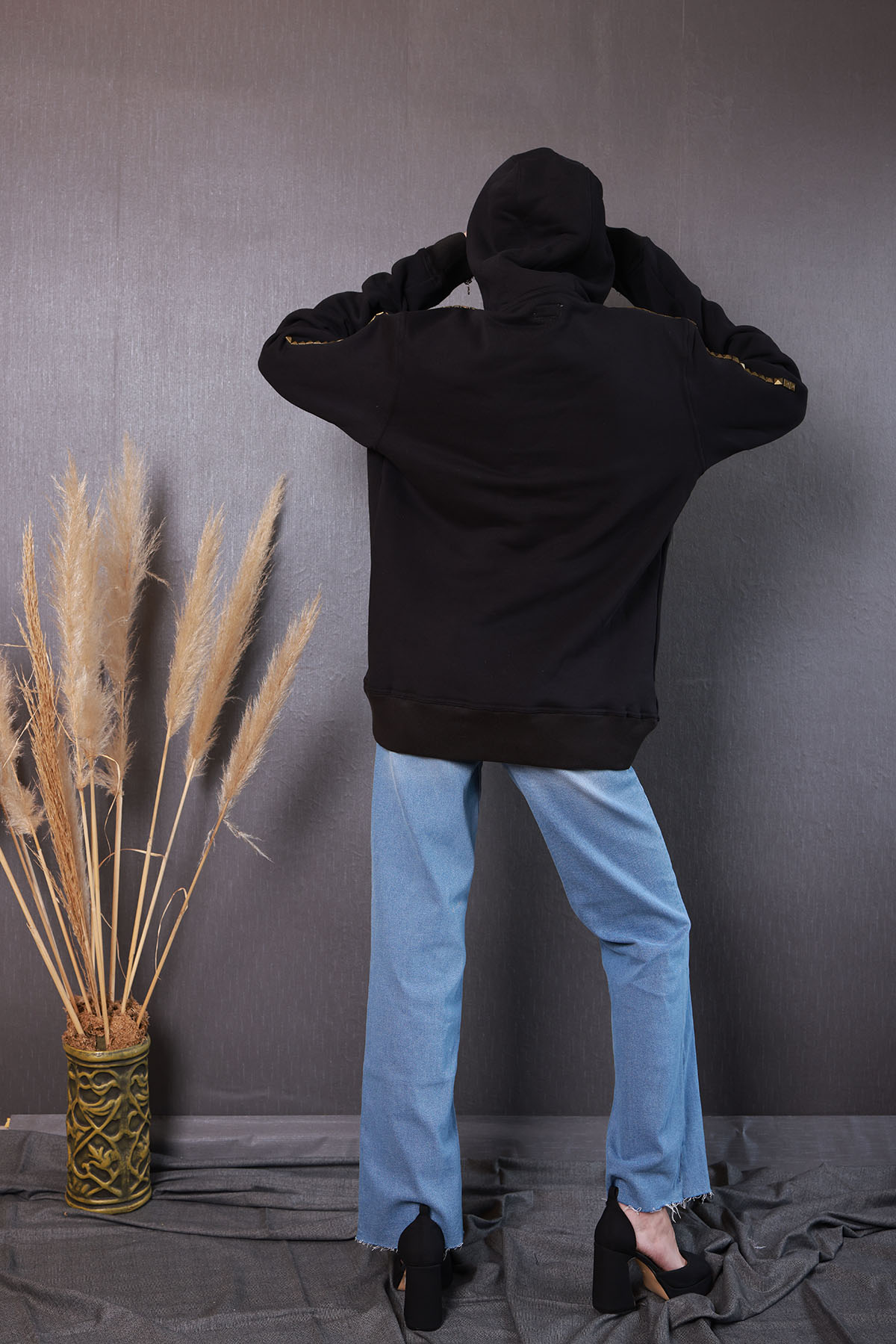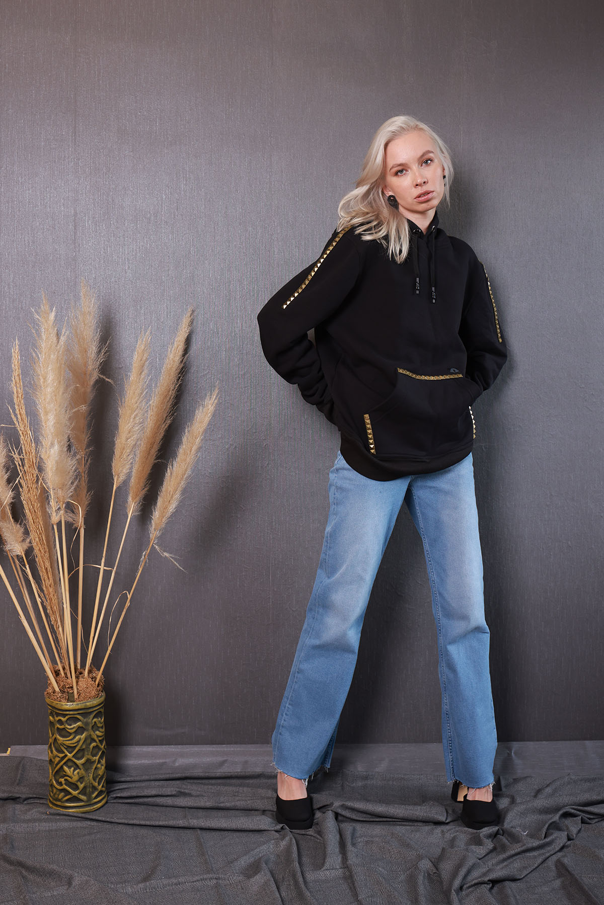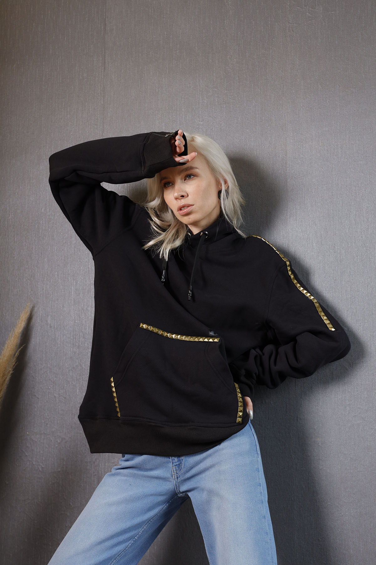 Omuzlarında, kangru cep kenarlarında piramit gold rengi taş aksesuar kullanılmıştır.