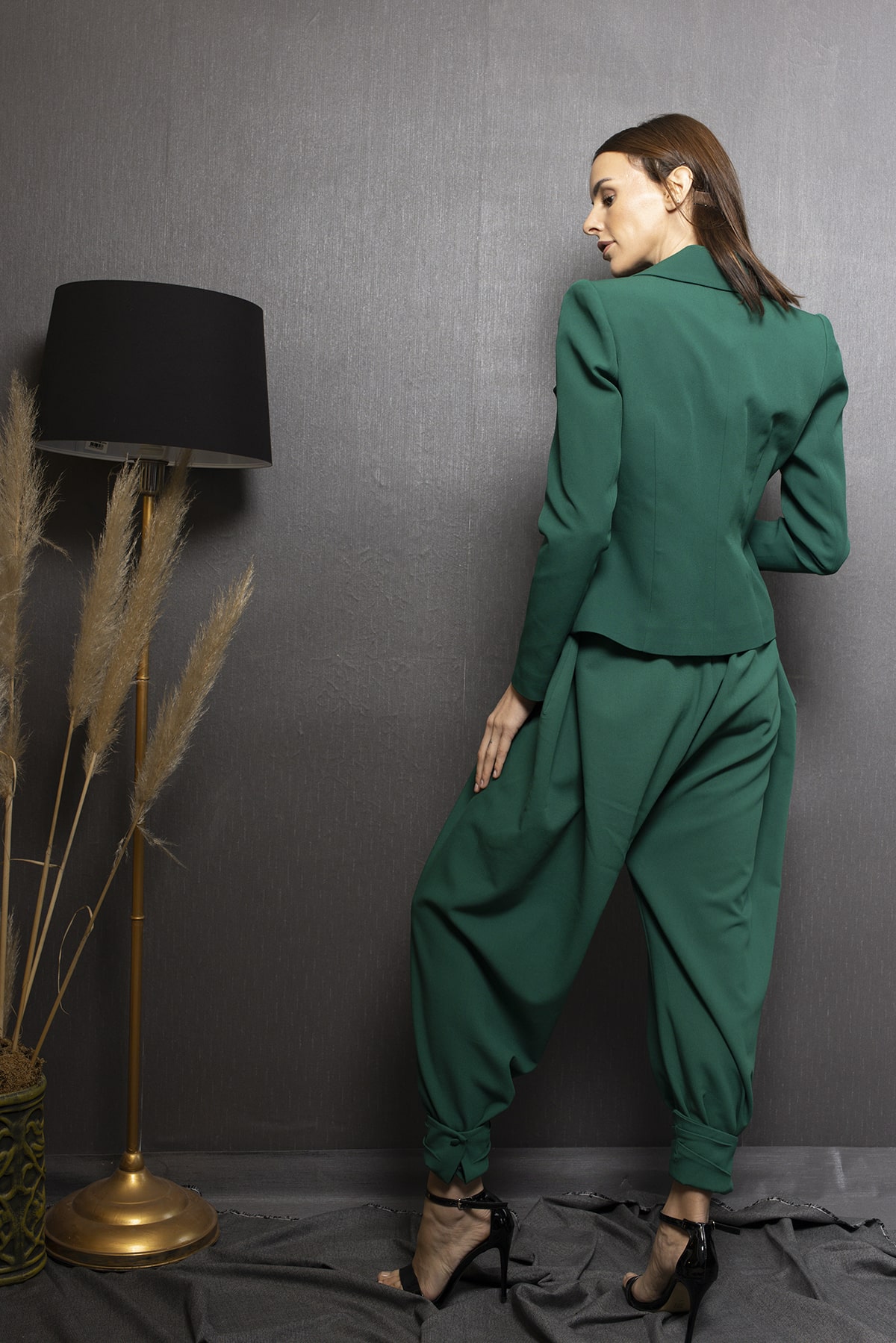 Belden kesik, ikili takım görünümünde, pantolon kısmı modern şalvarlı paça kısmı bilekten manşetli ve kumaş baskı düğmeli çok özel tasarlanmış, polviskon kumaştan oluşmuştur.