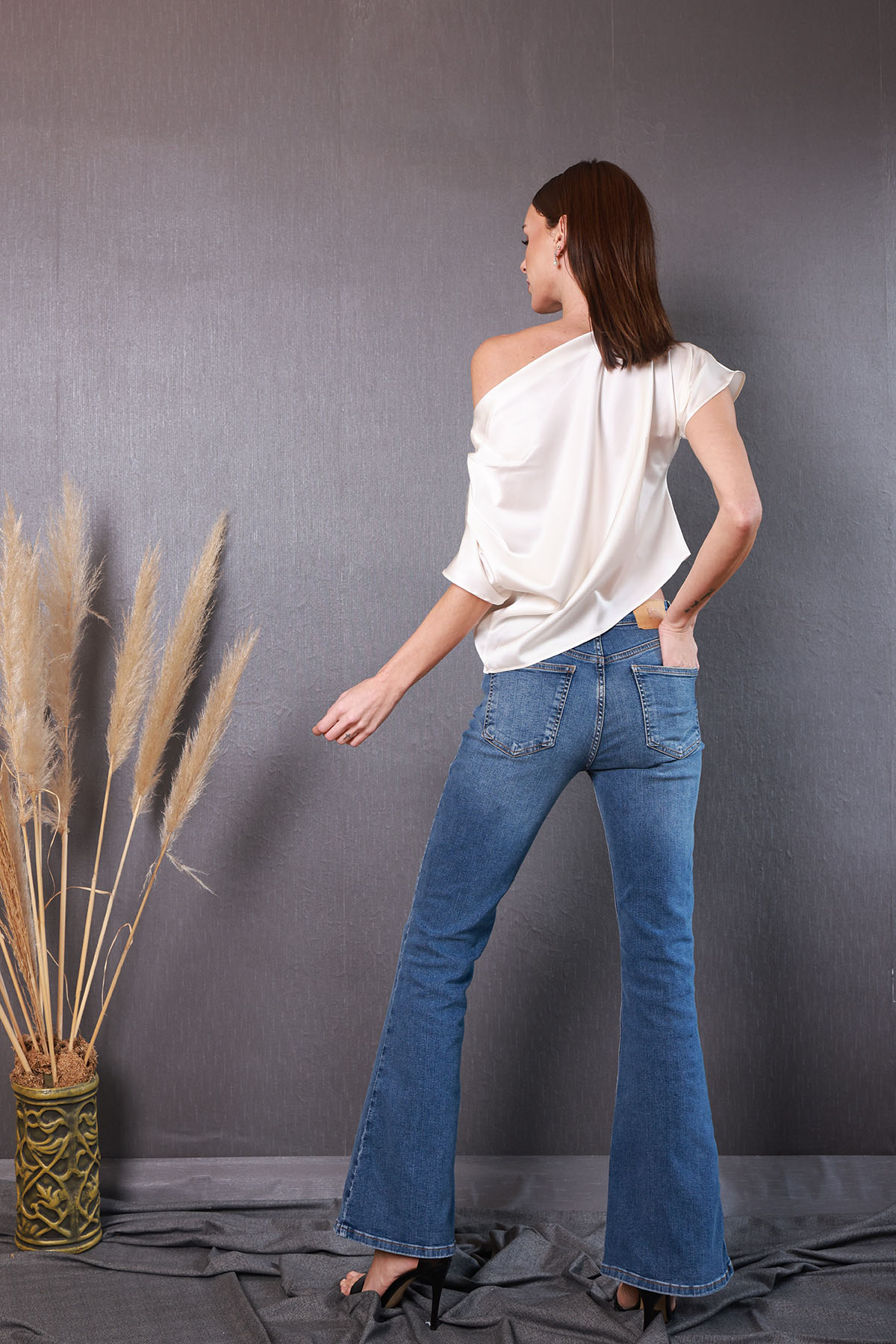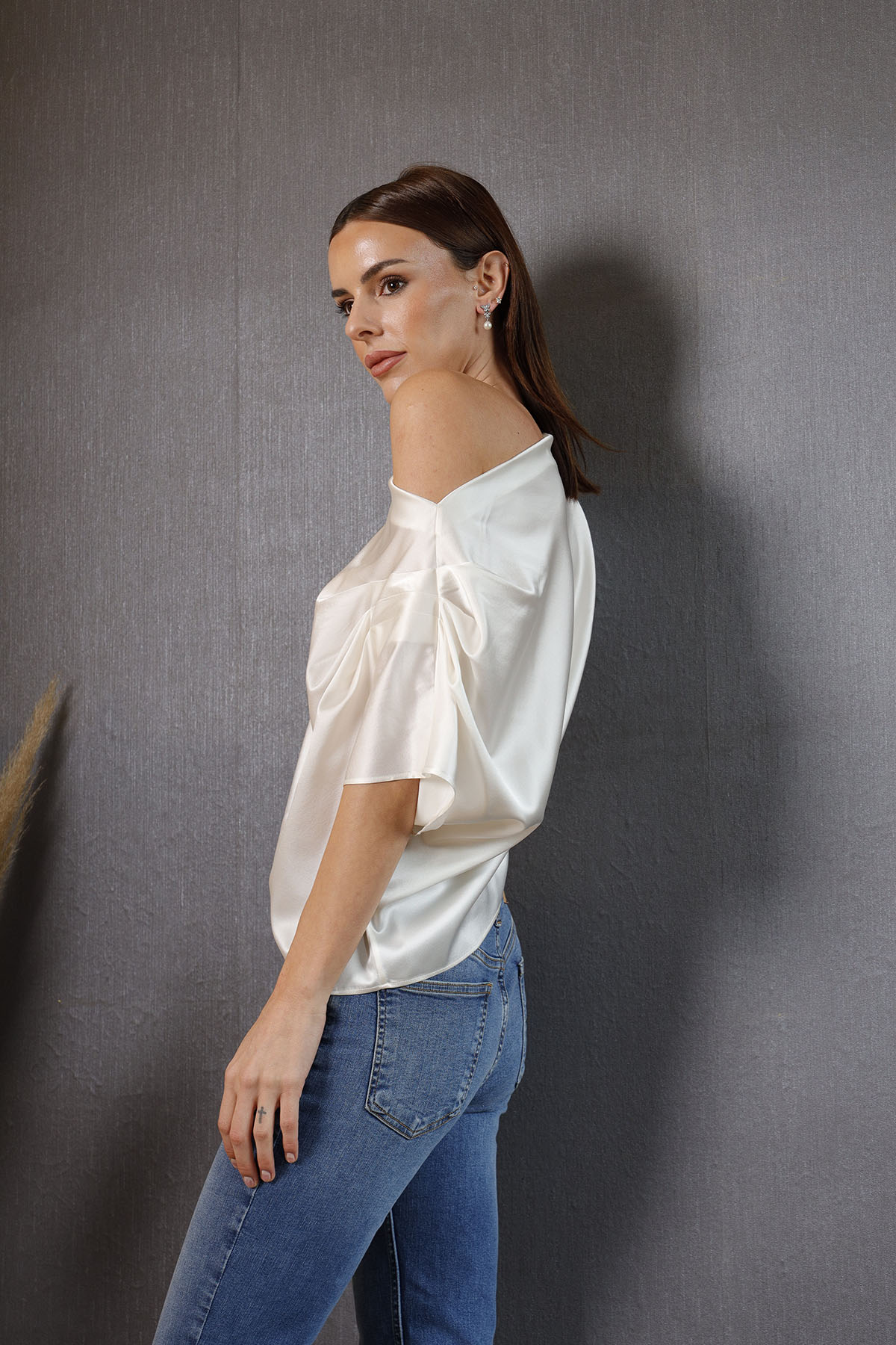 Bluzumuz %100 silk, ofWhite,asimetriktir. Bedeni rahat kalıptır.