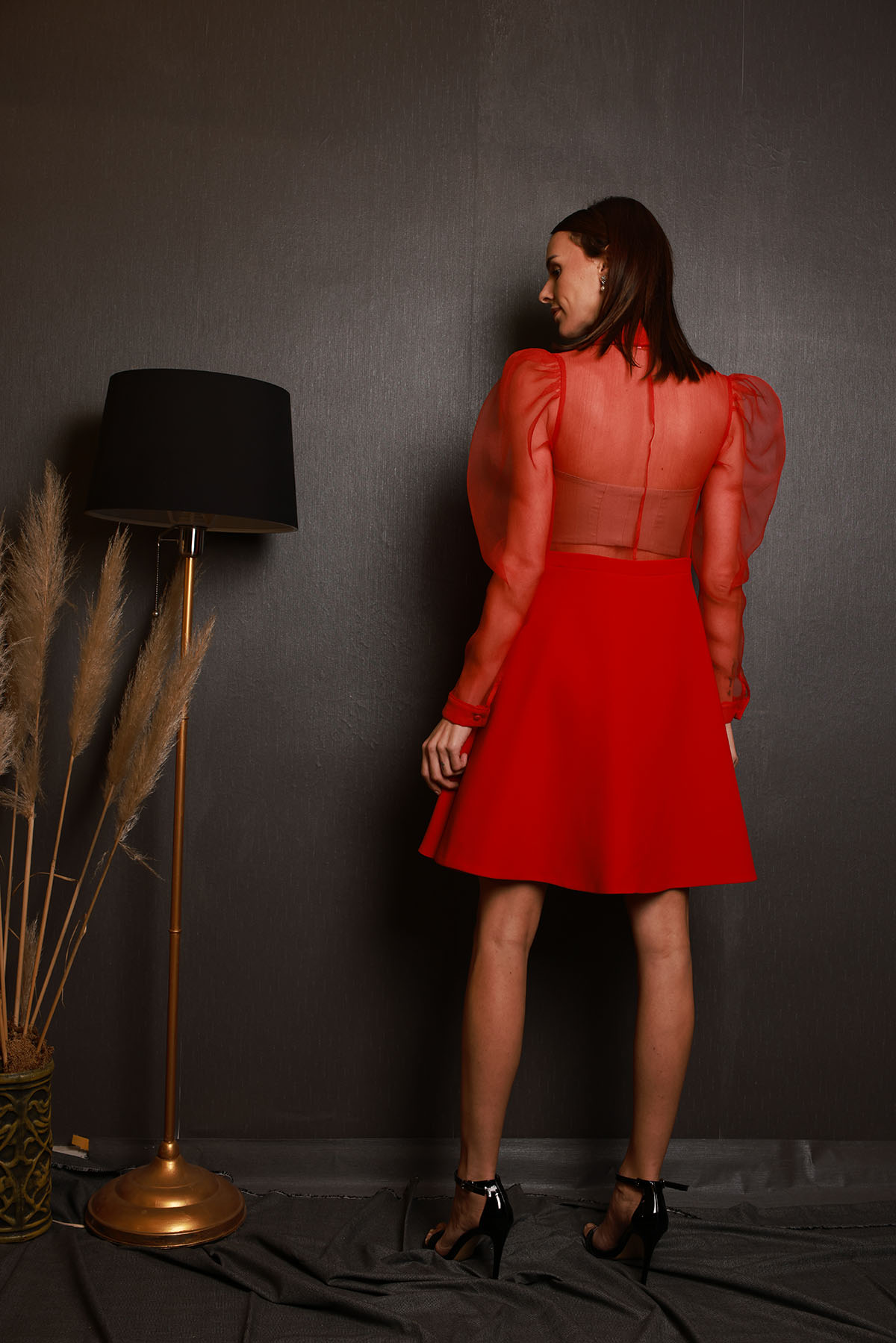Özel tasarım olan elbise üst bedeni transparan ve Swarovski taşlarla özel işlenmiş, ön patında ve manşetlerinde kumaşından baskı düğmeli kolları balon formunda belden kesik olup, eteği daire formunda belinde kemer olup sol yandan fermuarlıdır.