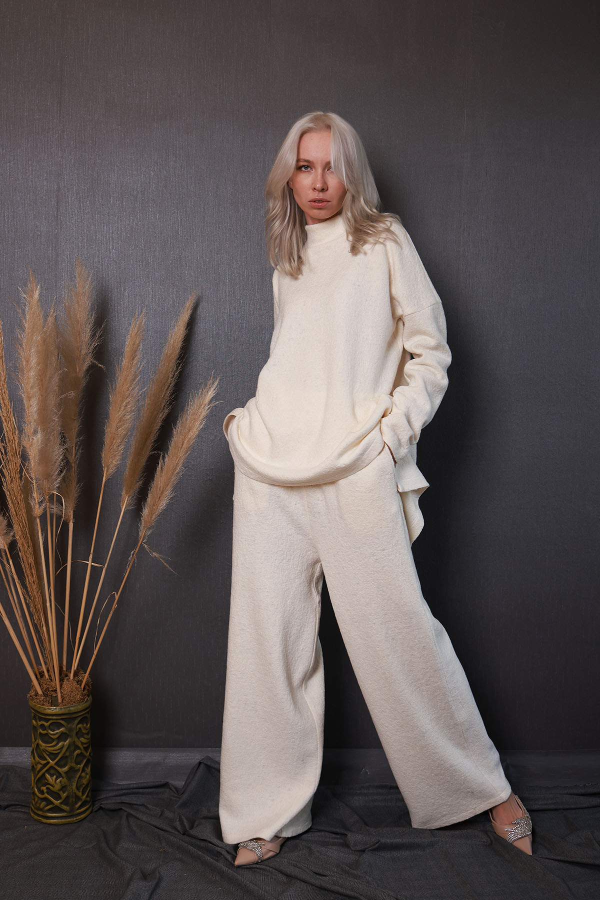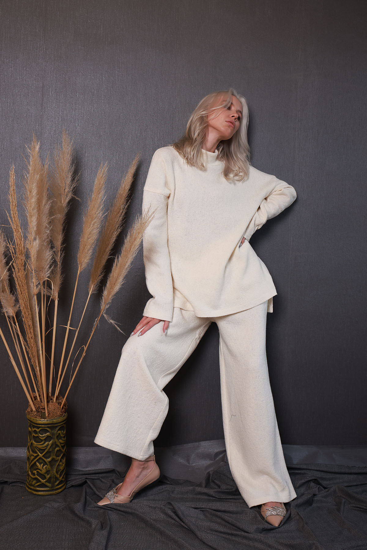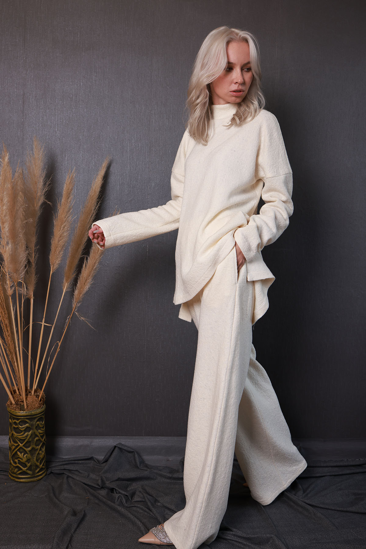 Eşofman takımımız %100 yün kumaştan olup, rahat kalıp, hakim yakalı, düşük omuzlu, pantalonu yandan cepli bir takımdır.