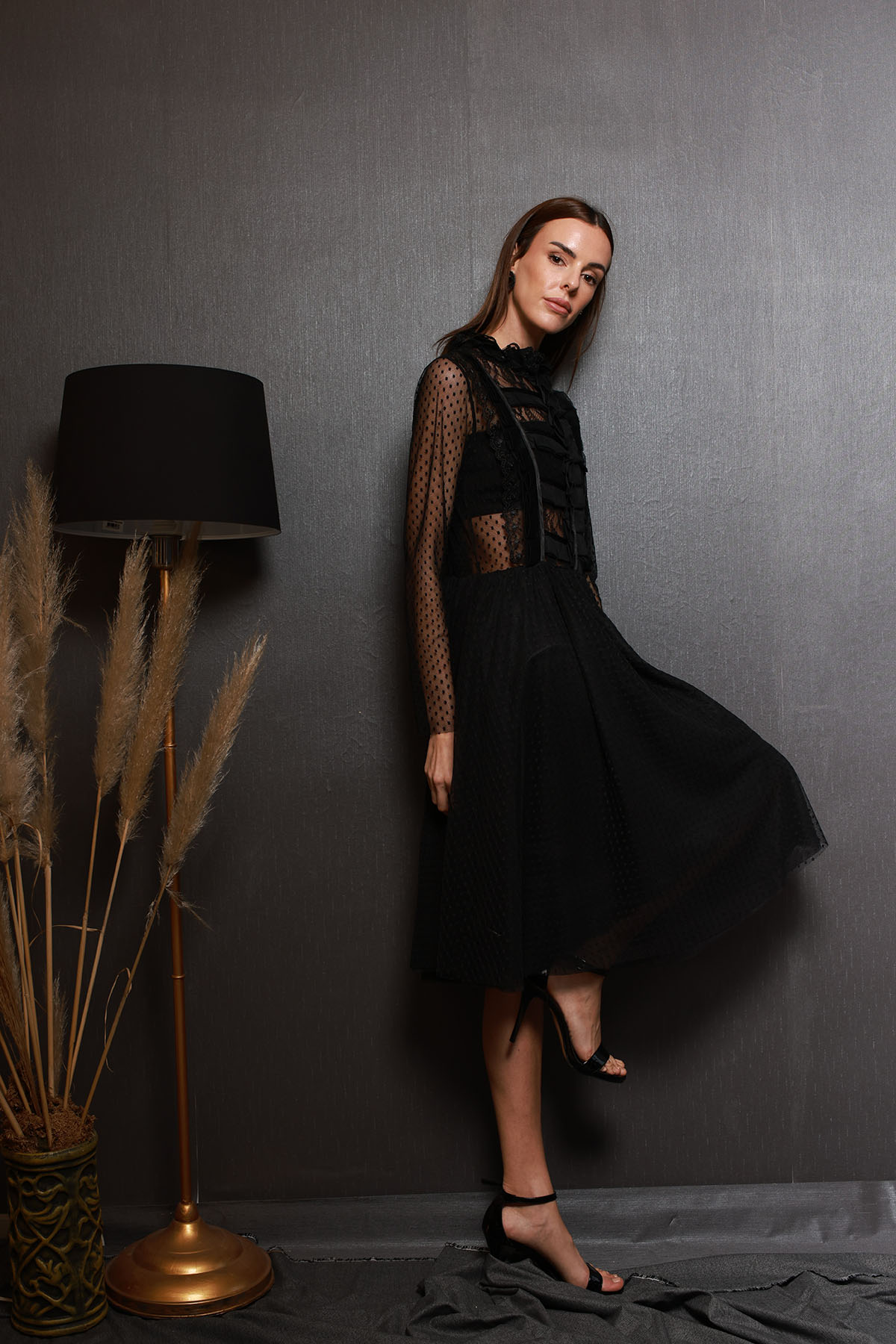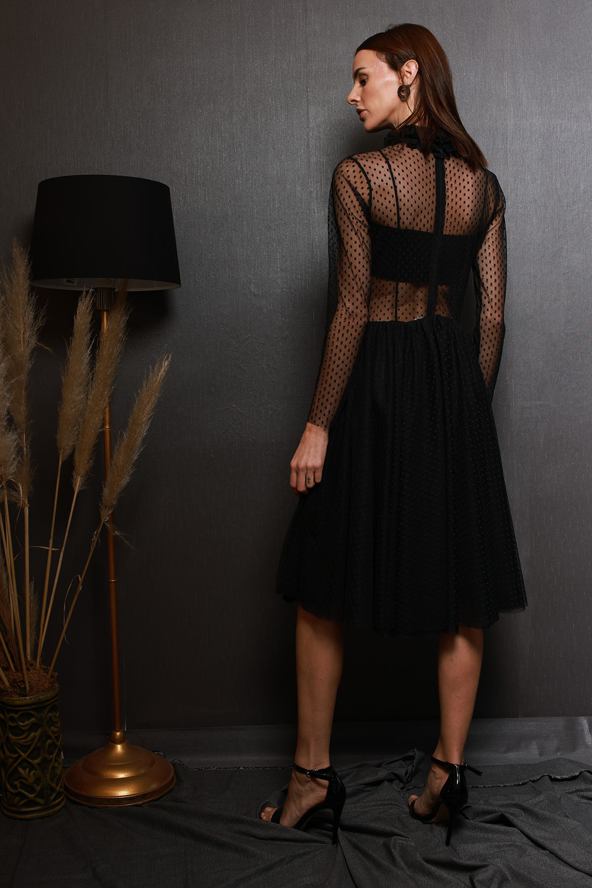 Kolları dar puantiye tülden yapılmıştır. Arkadan fermuarlı, midi boy, üst beden vücuda oturan modelimizin etek kısmında silk astar kullanılmıştır.