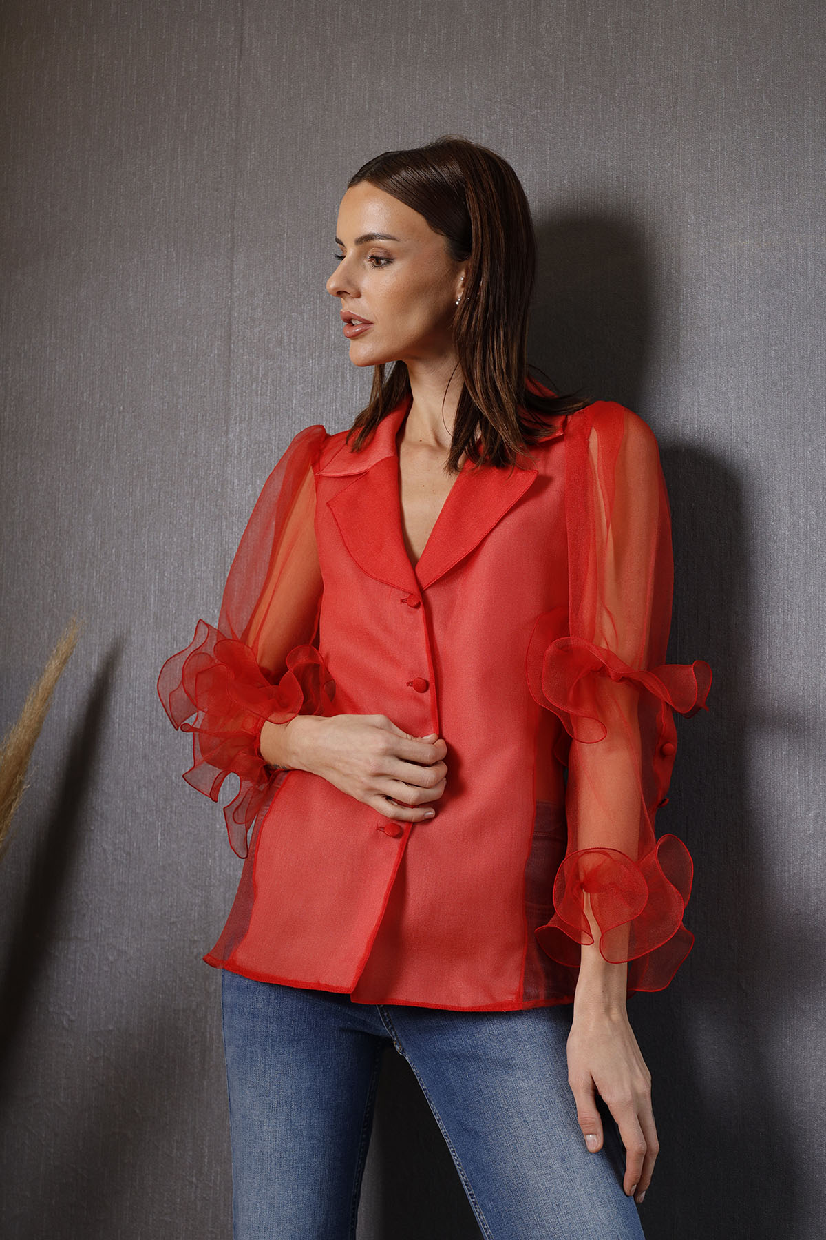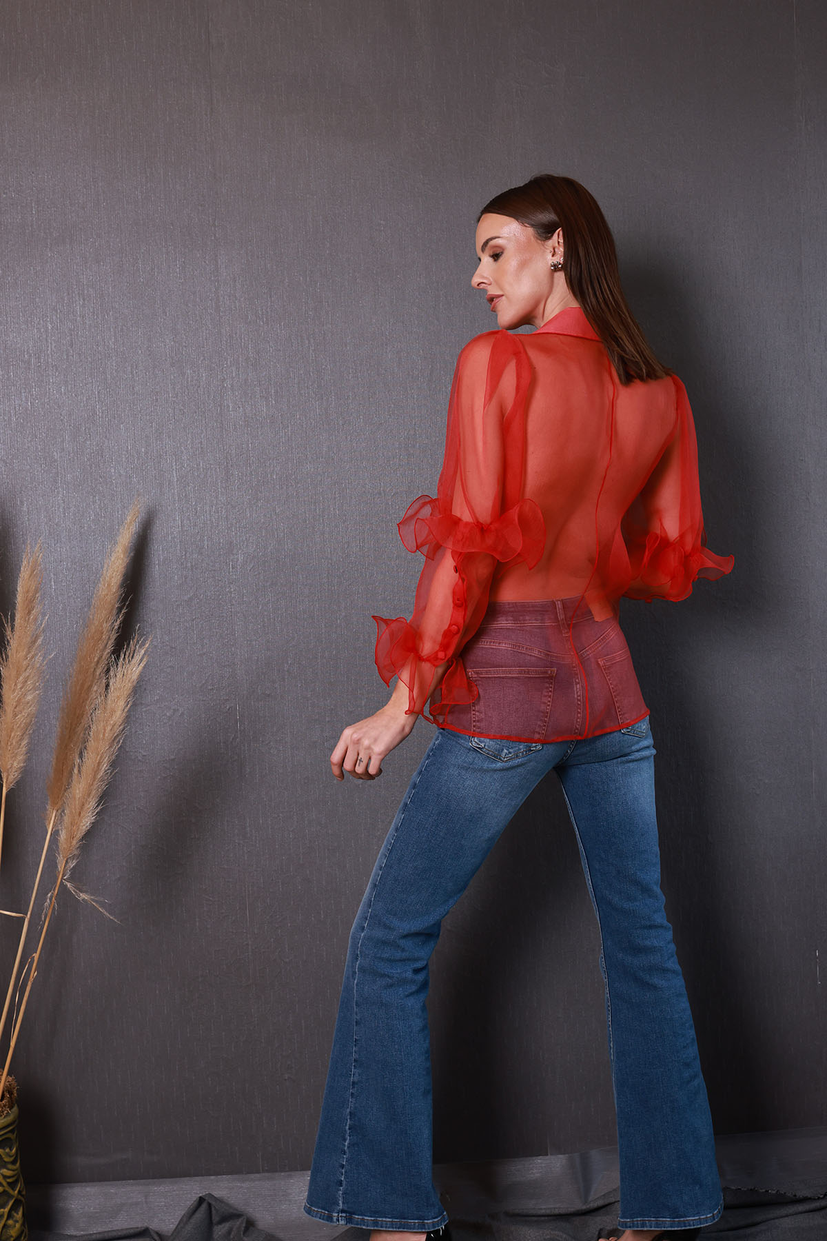 Zamansız koleksiyon parçalarından organze gömlek yakalı, omuzlar büzgülü kabarık, kol birleşimleri volanlı, düğmeleri kumaş kaplama transparan gömlek-bluz.