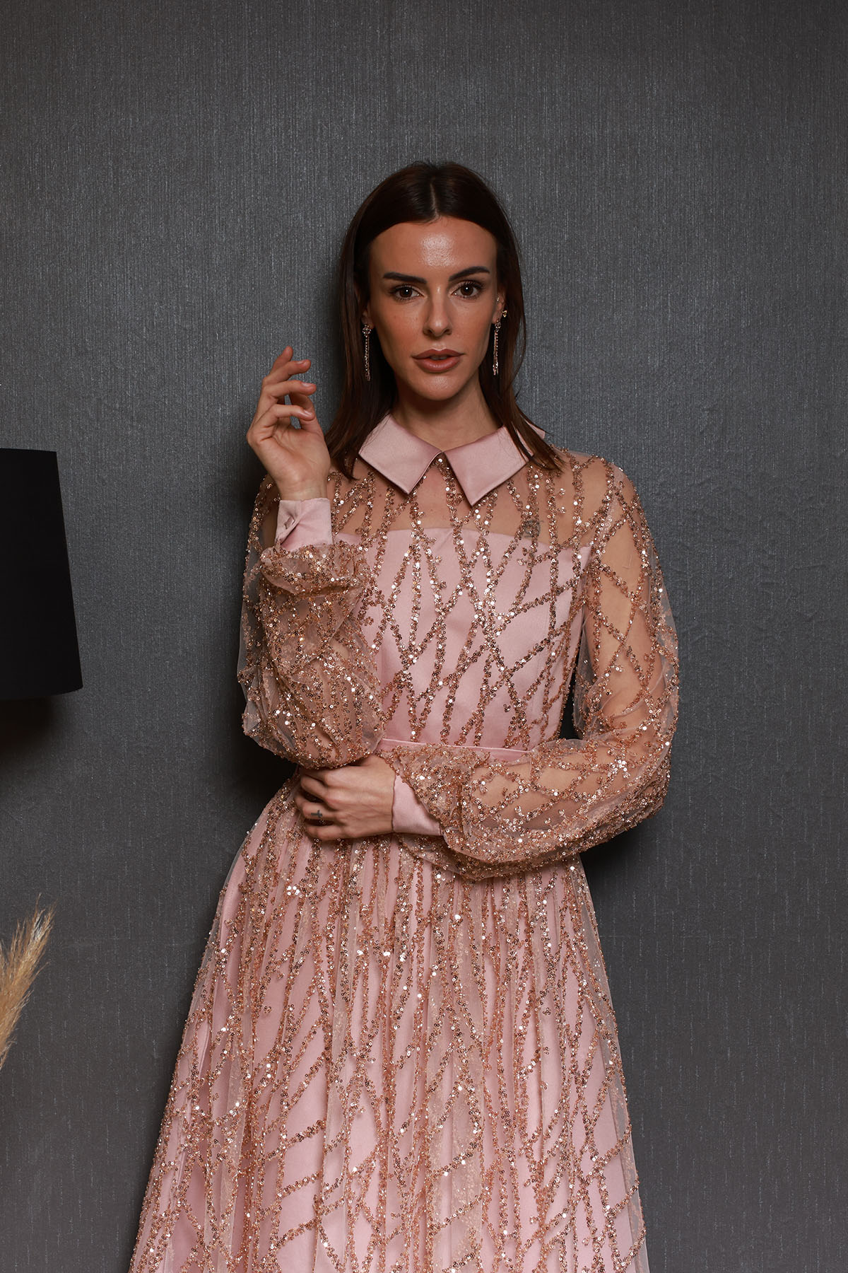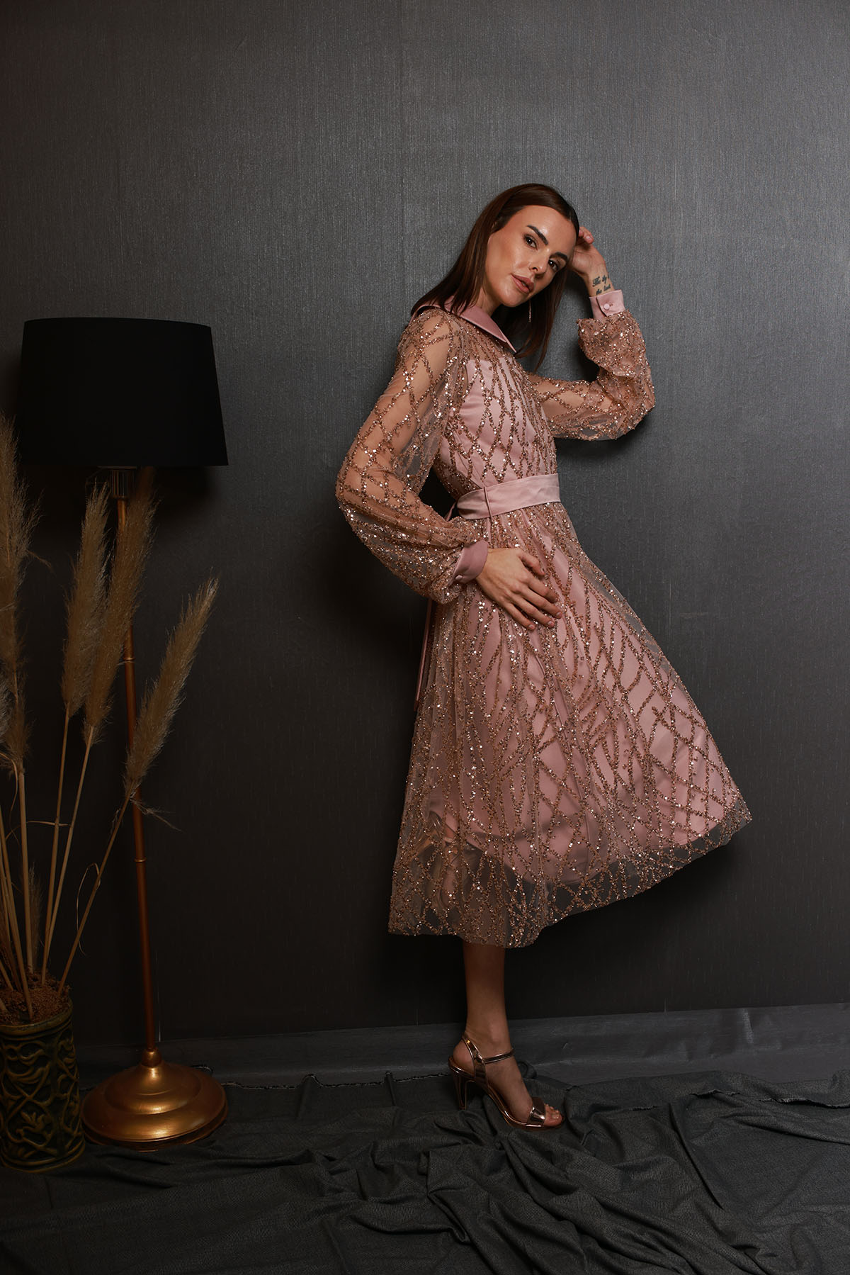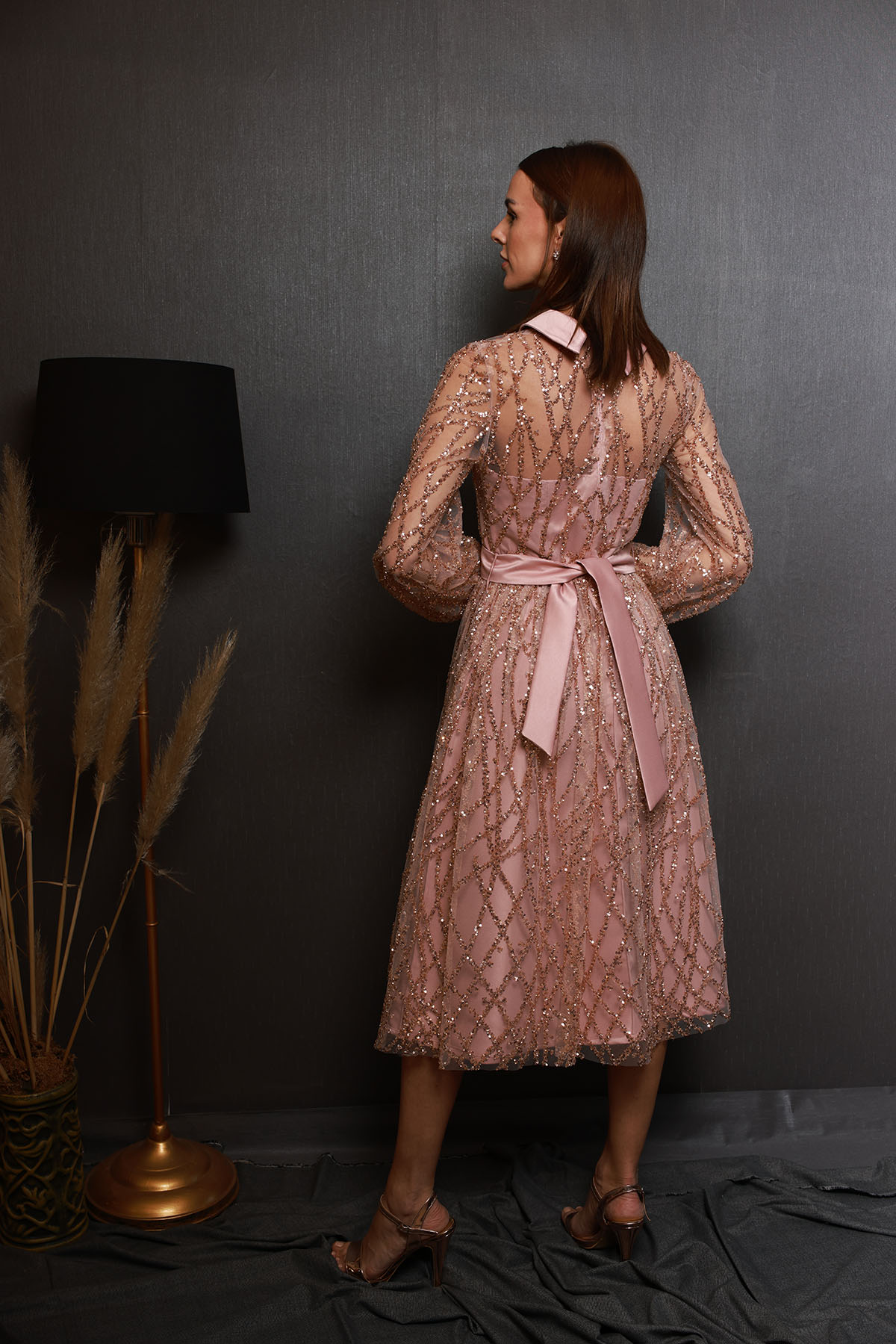 Pudra pembe, geometrik desenli taş işlemeli midi boy, iç astarı straples uzun kollu ve kol ağızları büzgülü, iç astar kumaşından manşetli, manşetleri ilik düğmeli eleganze elbise.