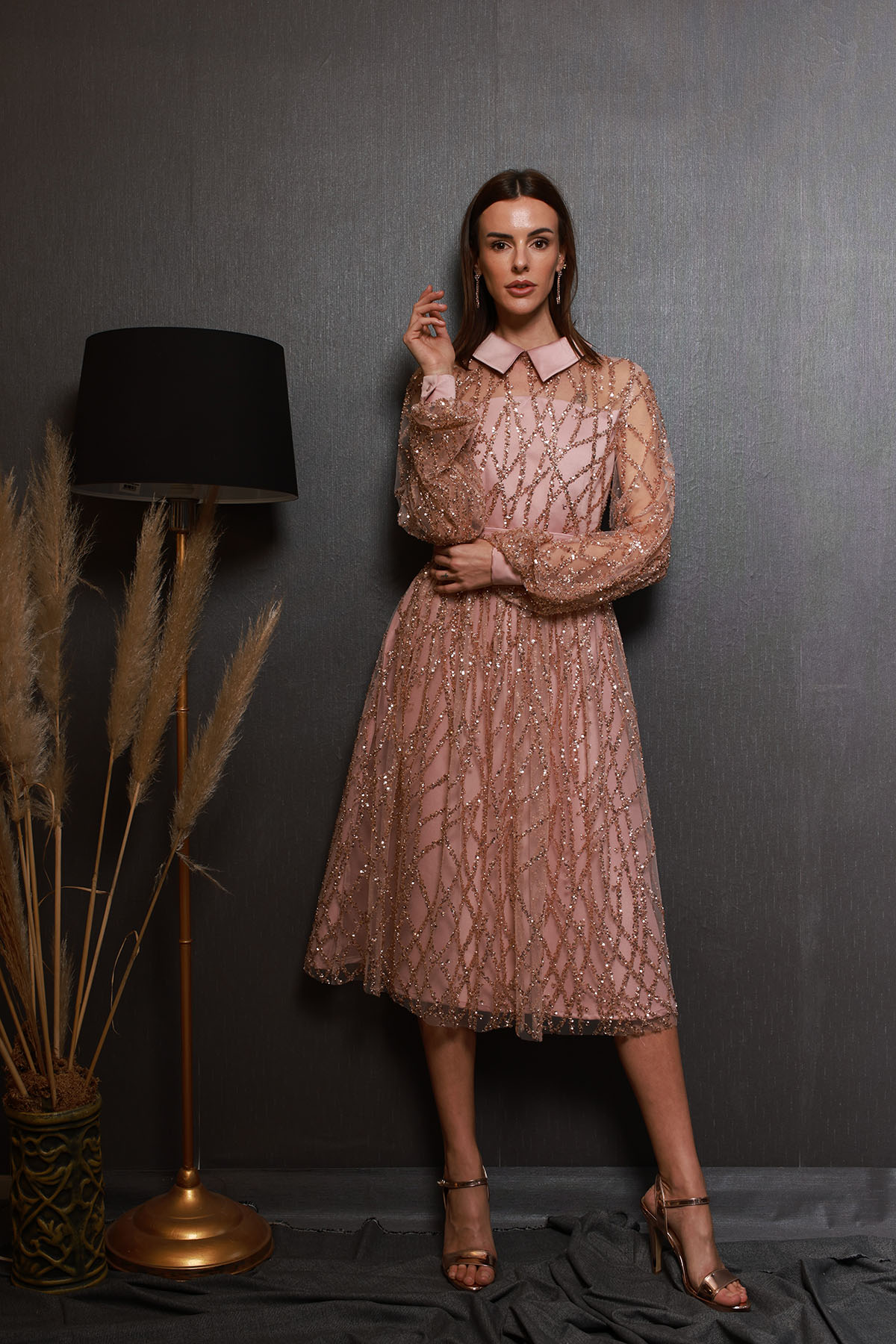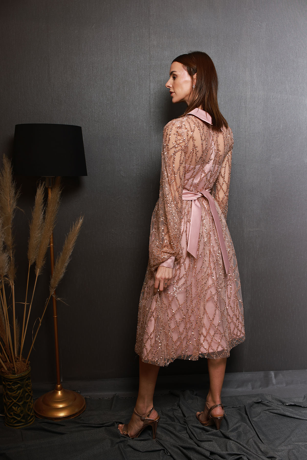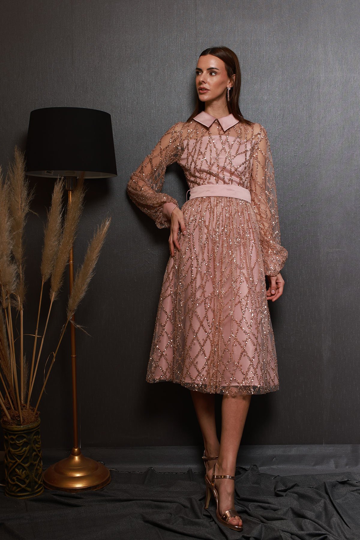 Pudra pembe, geometrik desenli taş işlemeli midi boy, iç astarı straples uzun kollu ve kol ağızları büzgülü, iç astar kumaşından manşetli, manşetleri ilik düğmeli eleganze elbise.