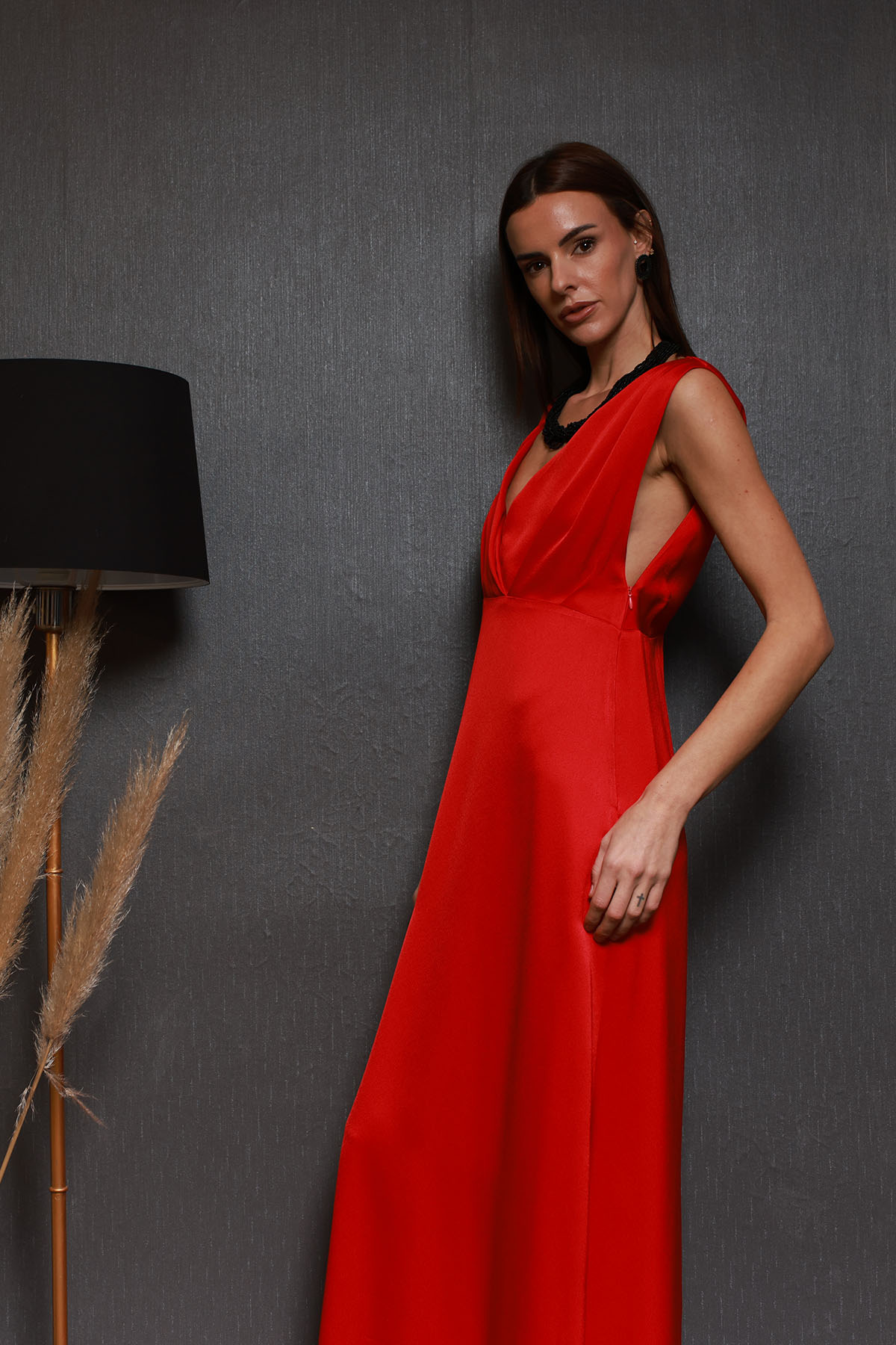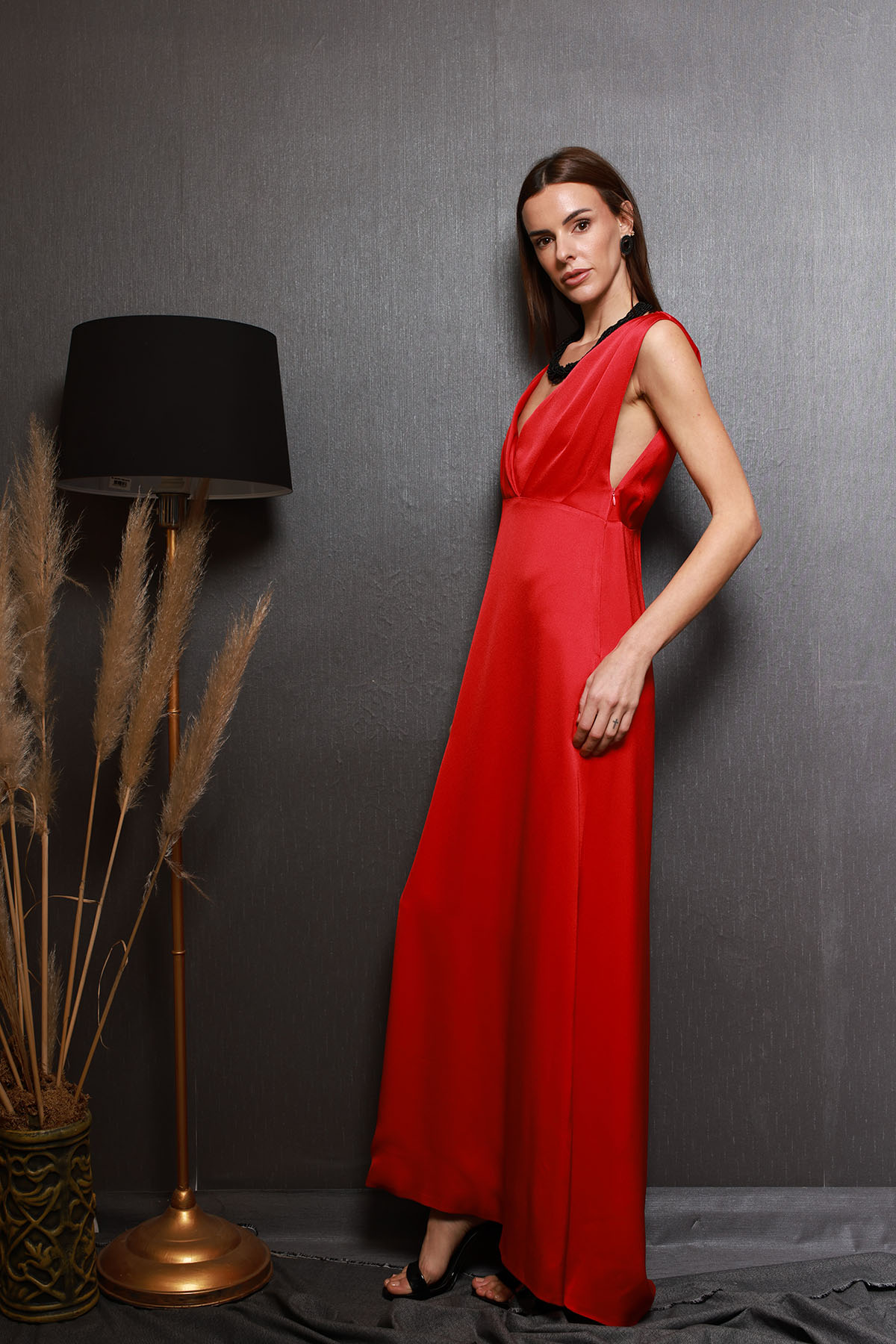 Modelimiz göğüs altından kesik, üst kısmı el drapeli, göğüs ve sırt dekolteli, ön kısmı kruvaze üst üste binmeli etek kısmı hafif A kesimli, arka etek hafif kuyruklu soldan fermuarlı, eleganze, özel tasarım davet ve balo elbisesi.